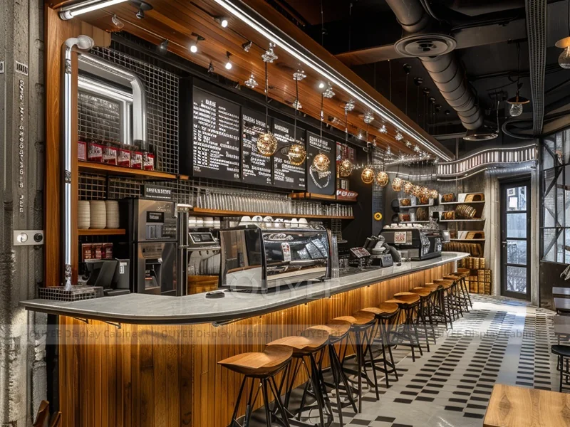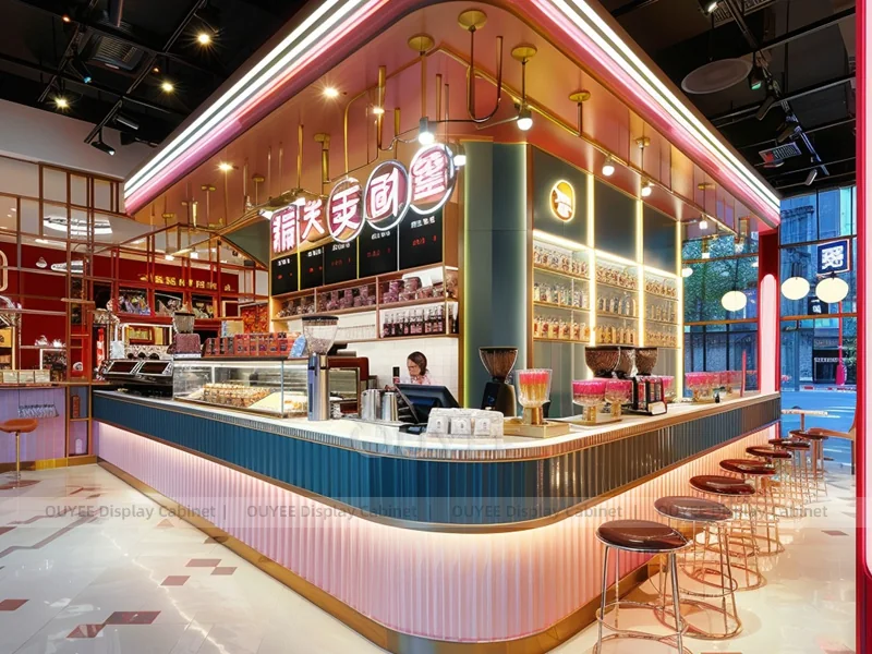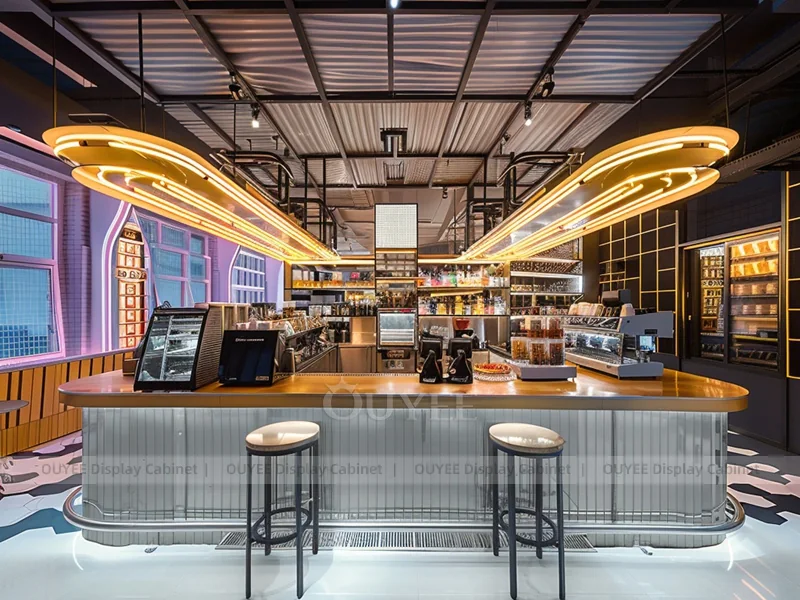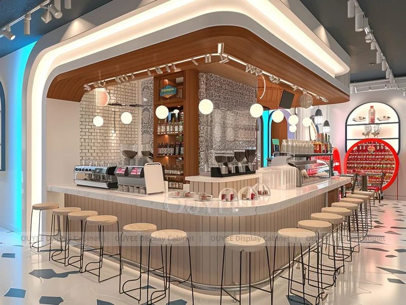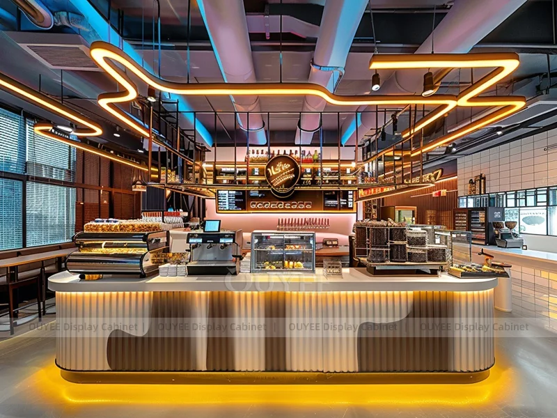 OUYEE supports coffee counter design, shop drawings, material selection, manufacturing, packing, and export delivery. We can customize the fixture according to your brand color, logo, store size, electrical planning, and installation requirements.