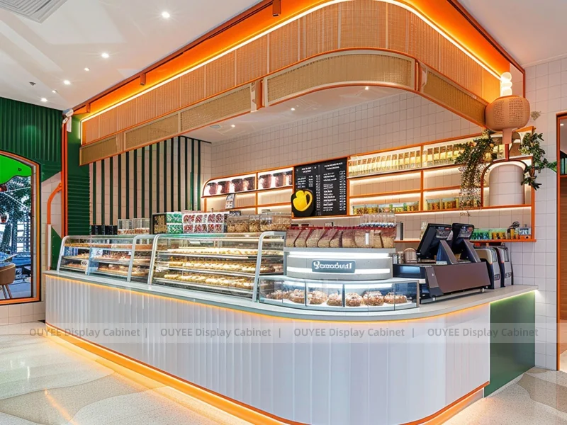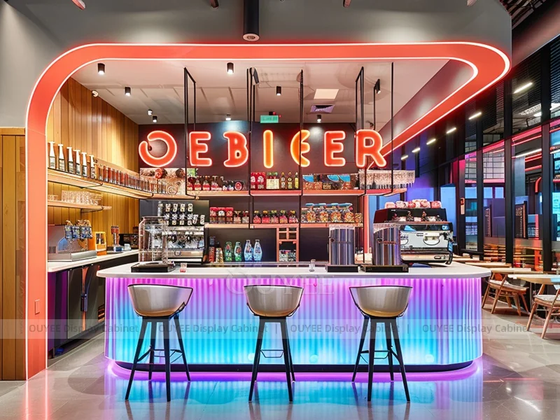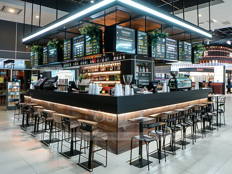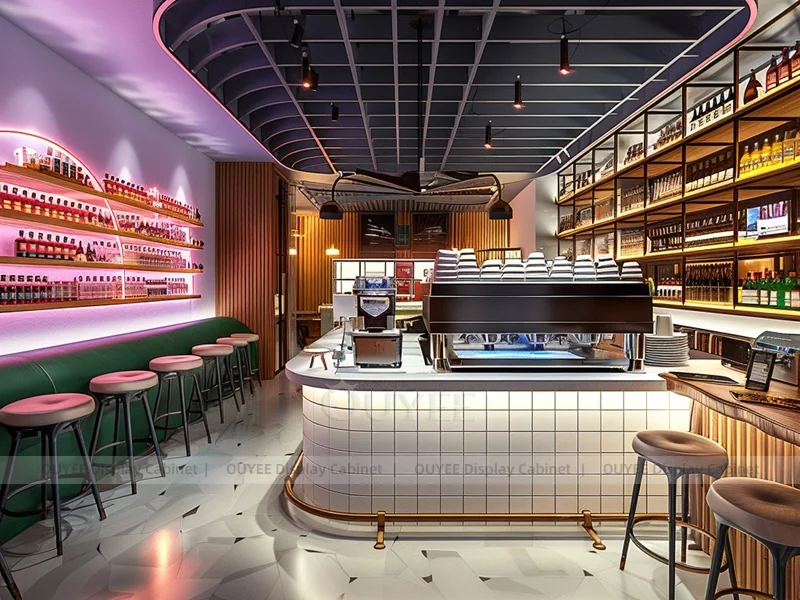 OUYEE supports coffee counter design, shop drawings, material selection, manufacturing, packing, and export delivery. We can customize the fixture according to your brand color, logo, store size, electrical planning, and installation requirements.