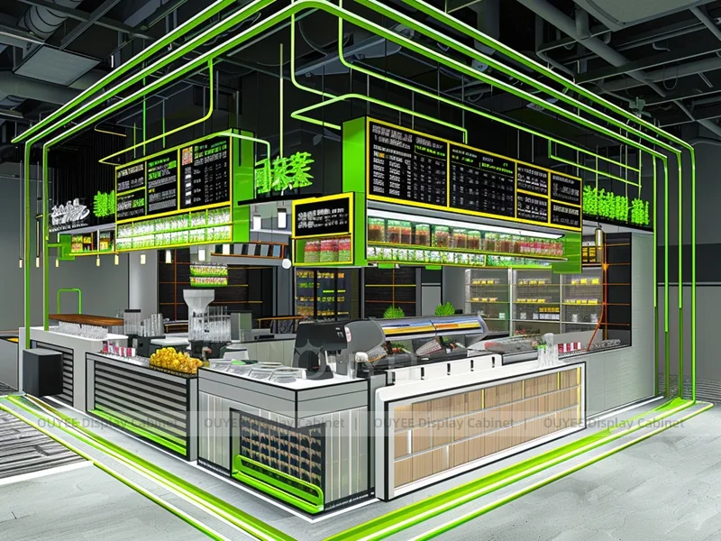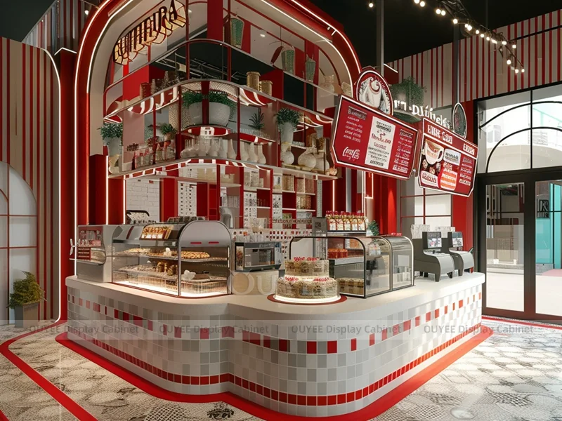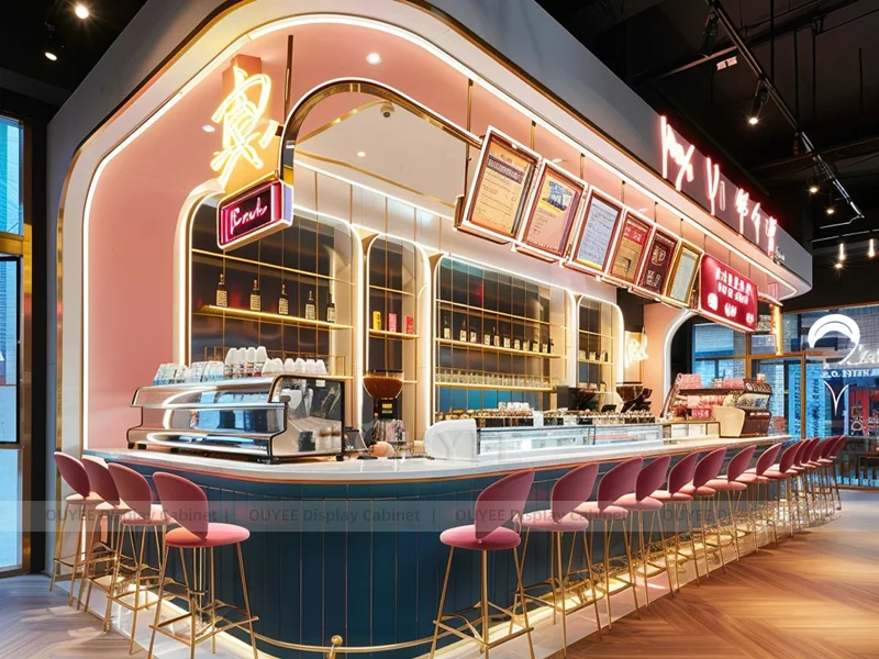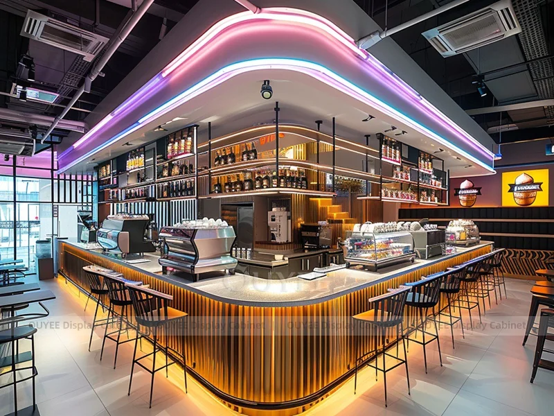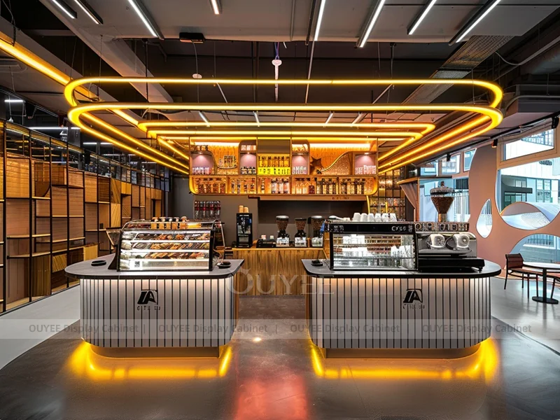 OUYEE supports coffee counter design, shop drawings, material selection, manufacturing, packing, and export delivery. We can customize the fixture according to your brand color, logo, store size, electrical planning, and installation requirements.