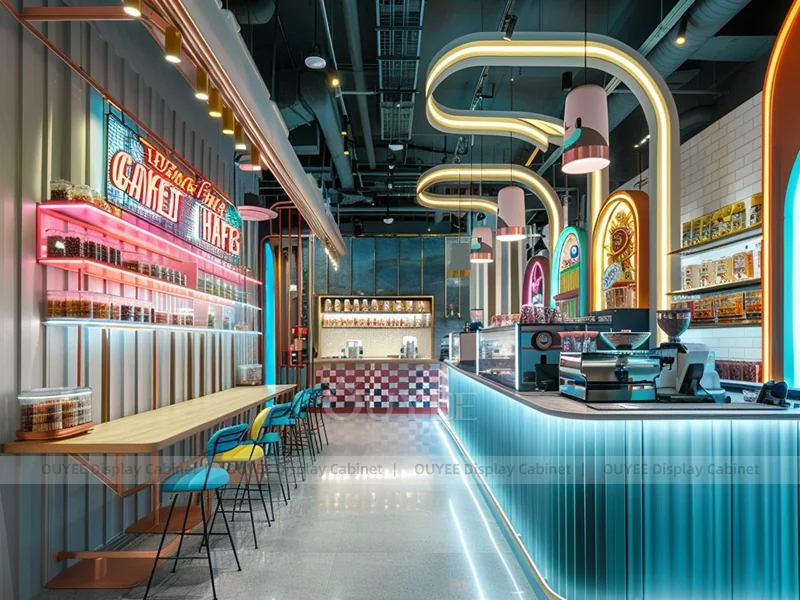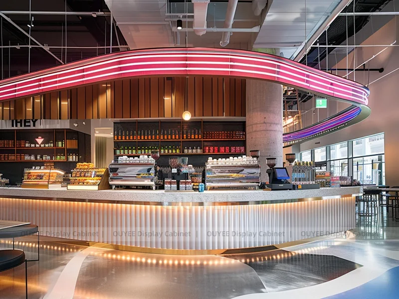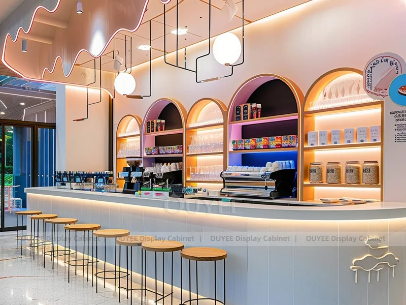 OUYEE supports coffee counter design, shop drawings, material selection, manufacturing, packing, and export delivery. We can customize the fixture according to your brand color, logo, store size, electrical planning, and installation requirements.