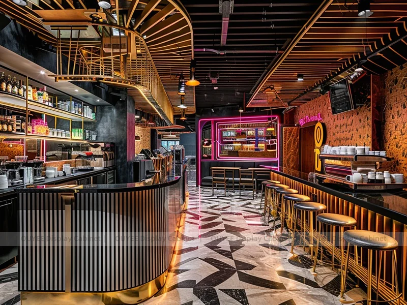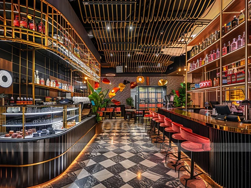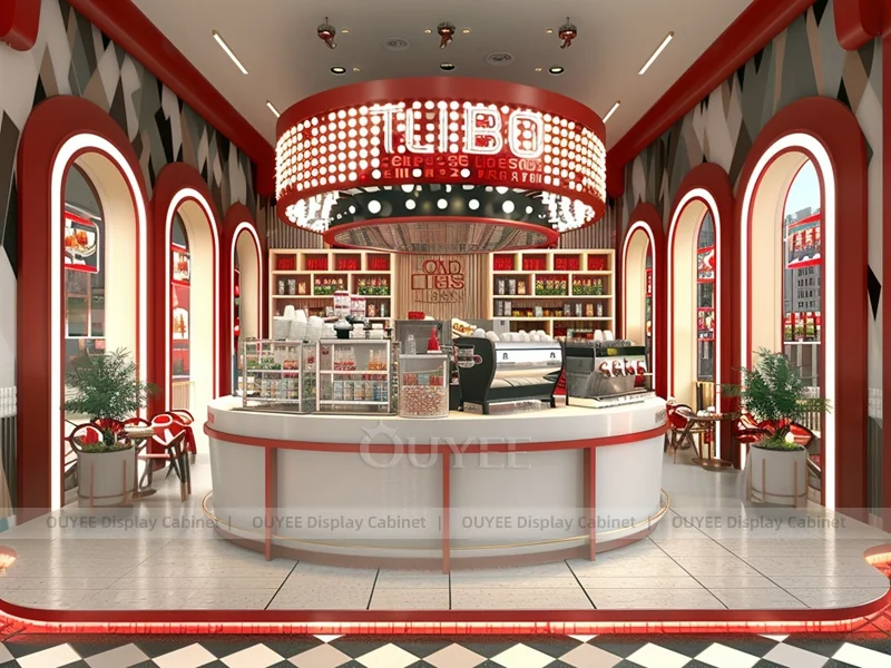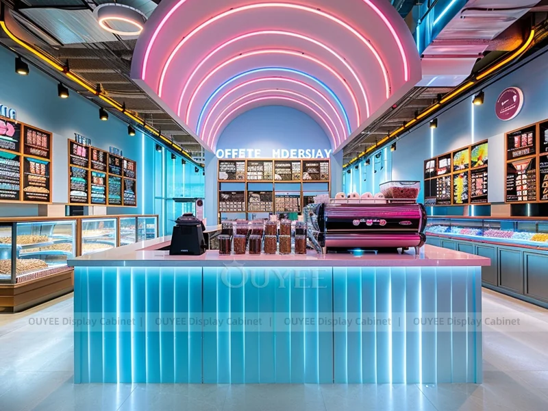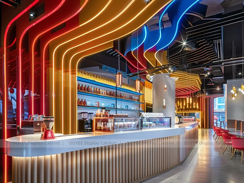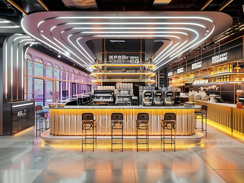 OUYEE supports coffee counter design, shop drawings, material selection, manufacturing, packing, and export delivery. We can customize the fixture according to your brand color, logo, store size, electrical planning, and installation requirements.
