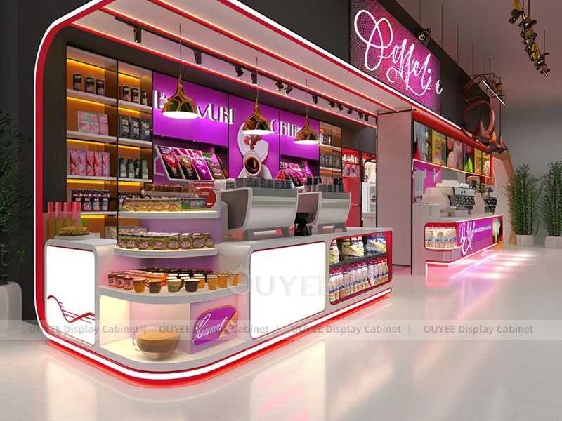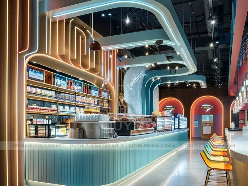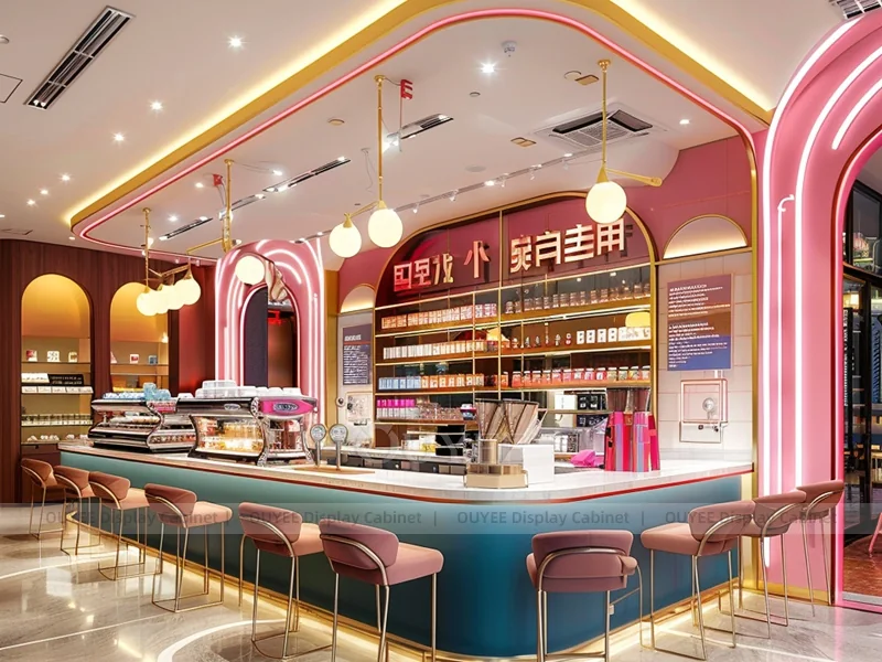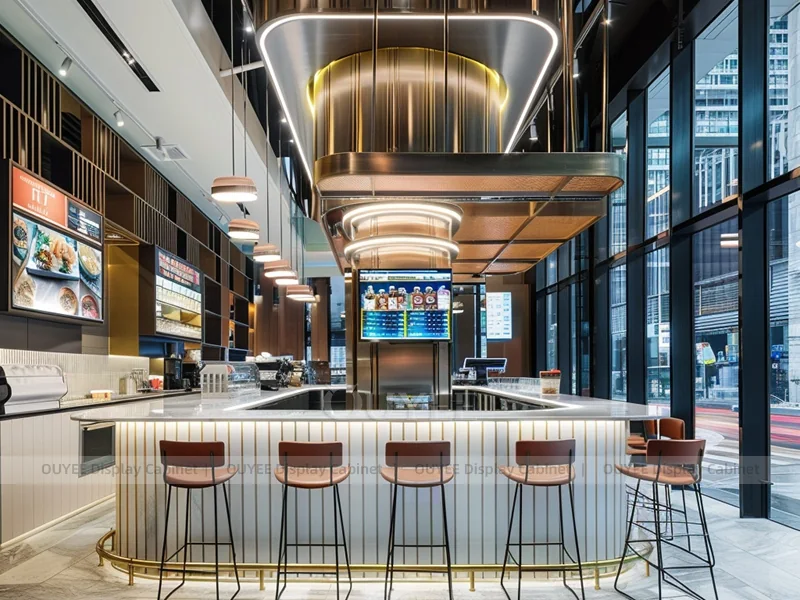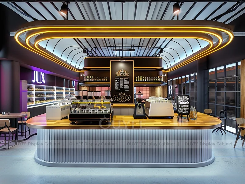 OUYEE supports coffee counter design, shop drawings, material selection, manufacturing, packing, and export delivery. We can customize the fixture according to your brand color, logo, store size, electrical planning, and installation requirements.