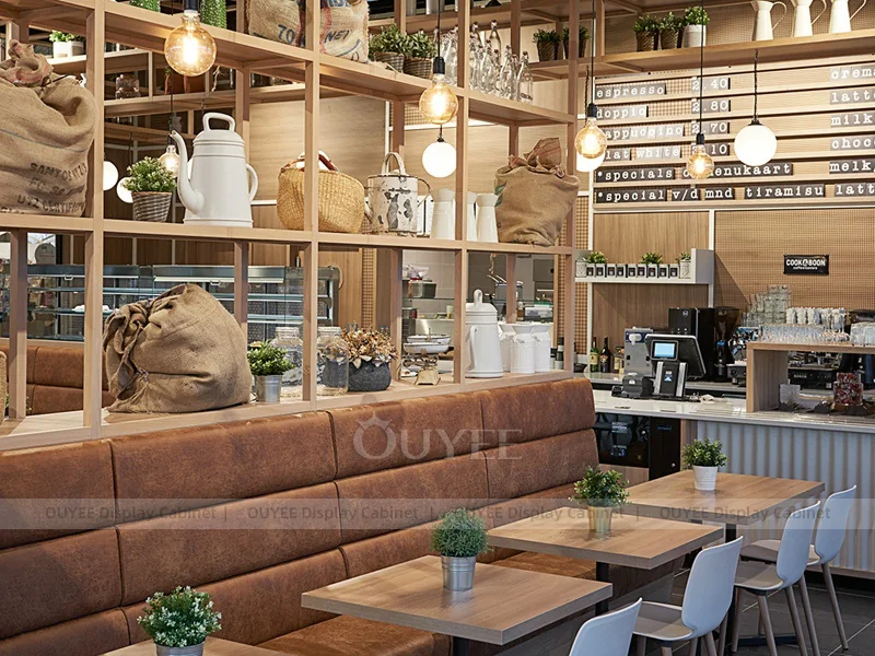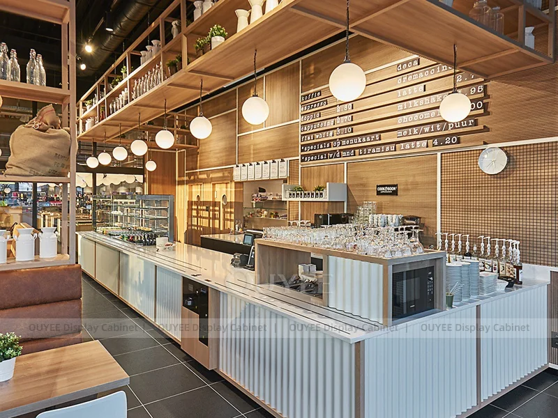 OUYEE supports coffee counter design, shop drawings, material selection, manufacturing, packing, and export delivery. We can customize the fixture according to your brand color, logo, store size, electrical planning, and installation requirements.