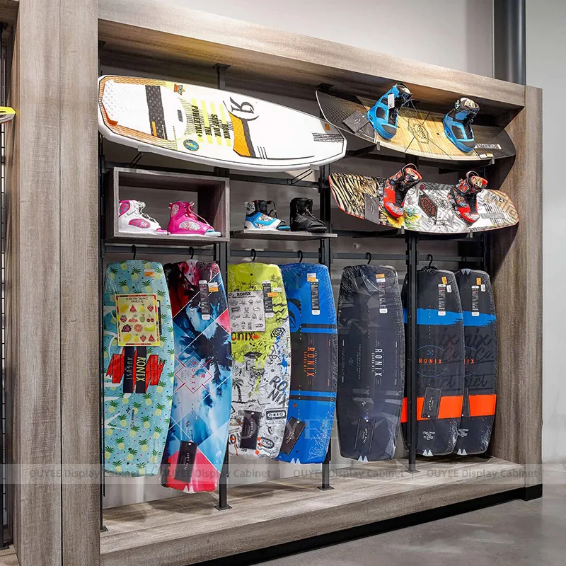 This configuration works well for sporting goods stores, active lifestyle retailers, fitness shops, and performance-focused retail interiors. It is suitable for stores that want custom display hardware, more coherent fixture language, and a practical combination of feature presentation, everyday stock holding, and shopper-friendly access.
