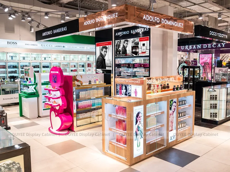 OUYEE can produce this model with commercial display panels, durable metal supports, tempered glass options, acrylic details, and integrated LED lighting. Dimensions, finish colors, shelf depths, light boxes, tester trays, logo panels, storage modules, and counter details can be adjusted to match the store plan and brand identity. Related inspiration is available across display shelves, display cases, wall display, and our store fixture manufacturing service.