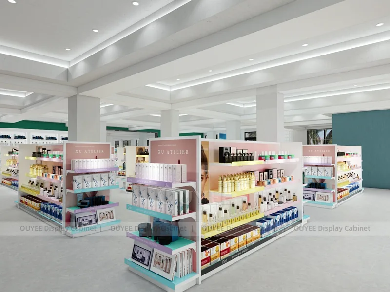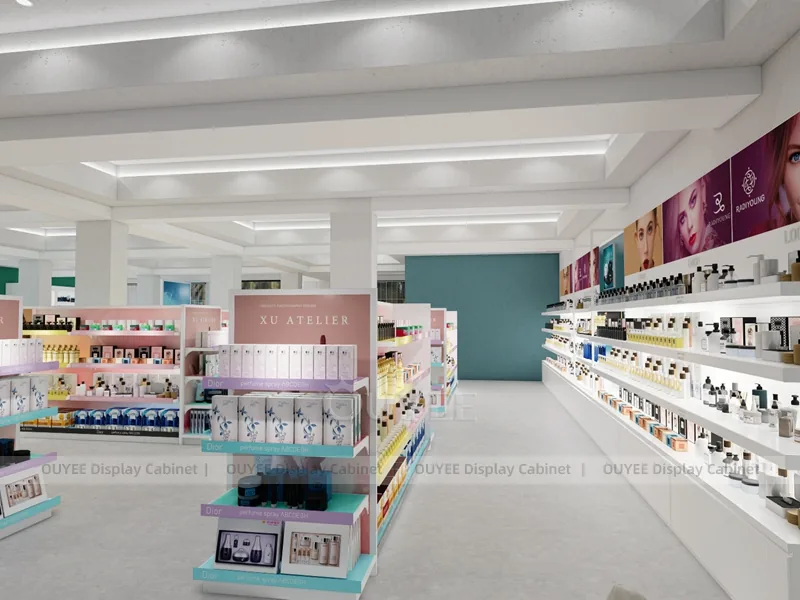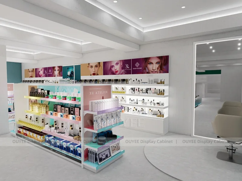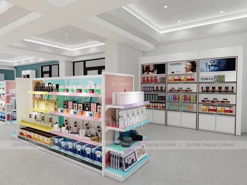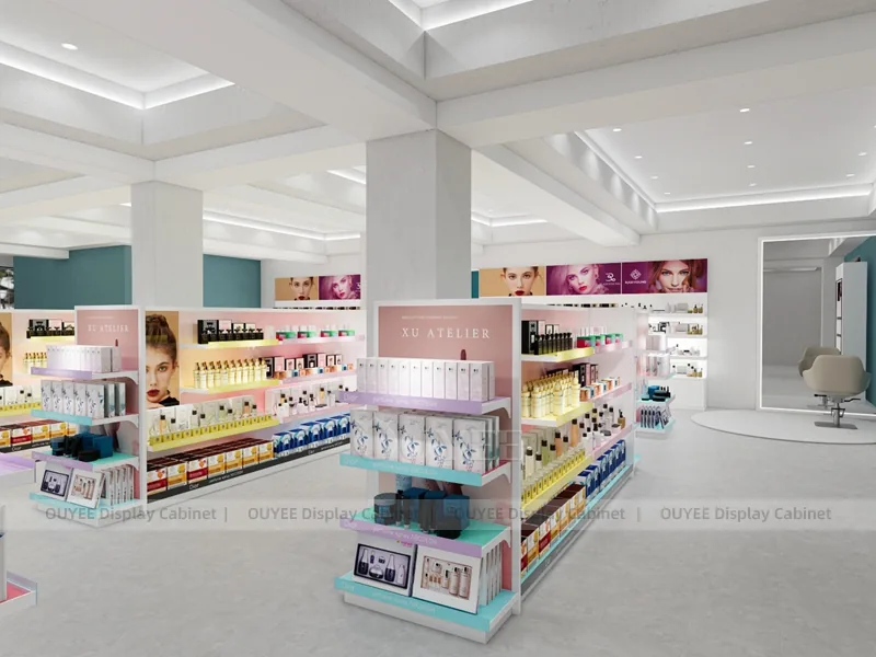 OUYEE can produce this model with commercial display panels, durable metal supports, tempered glass options, acrylic details, and integrated LED lighting. Dimensions, finish colors, shelf depths, light boxes, tester trays, logo panels, storage modules, and counter details can be adjusted to match the store plan and brand identity. Related inspiration is available across display shelves, wall display, display counter, and our store fixture manufacturing service.