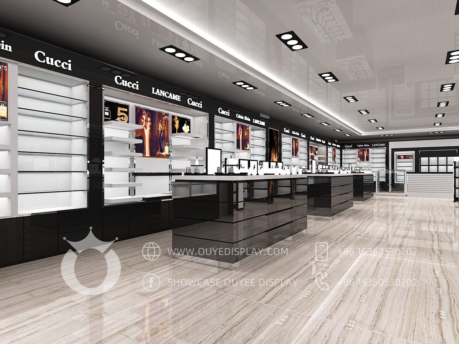 We suggest to add lighting fixtures that complement the perfume display furniture and store color theme.
