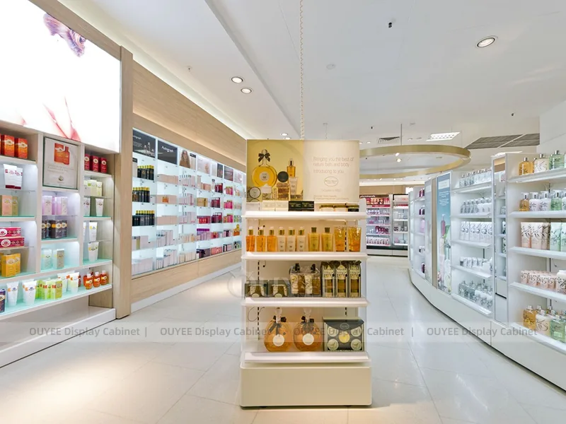 OUYEE can produce this model with commercial display panels, durable metal supports, tempered glass options, acrylic details, and integrated LED lighting. Dimensions, finish colors, shelf depths, light boxes, tester trays, logo panels, storage modules, and counter details can be adjusted to match the store plan and brand identity. Related inspiration is available across display shelves, wall display, display counter, and our store fixture manufacturing service.