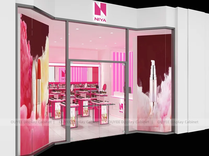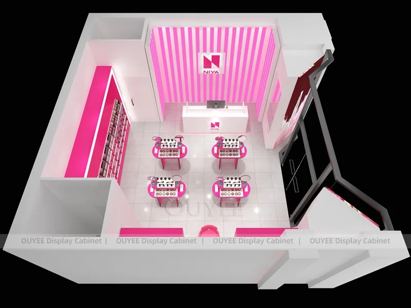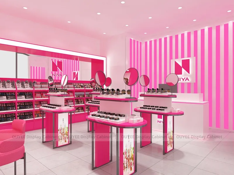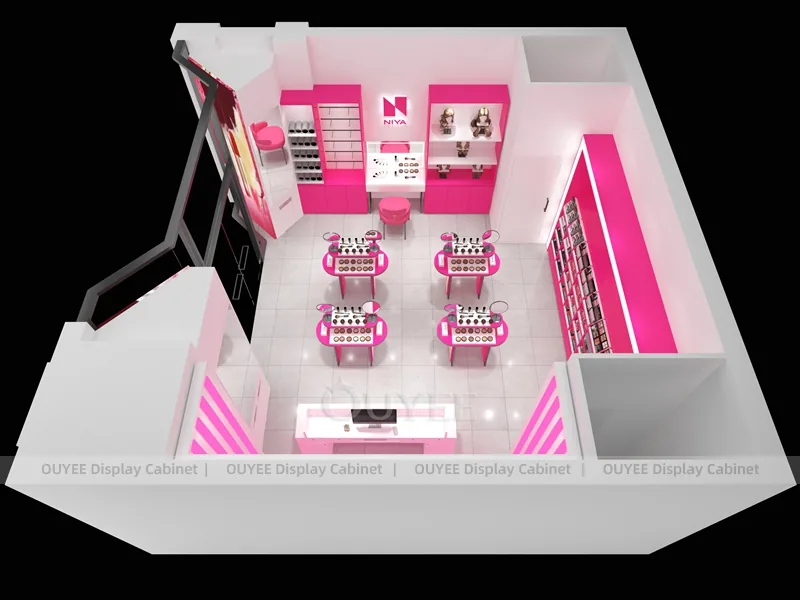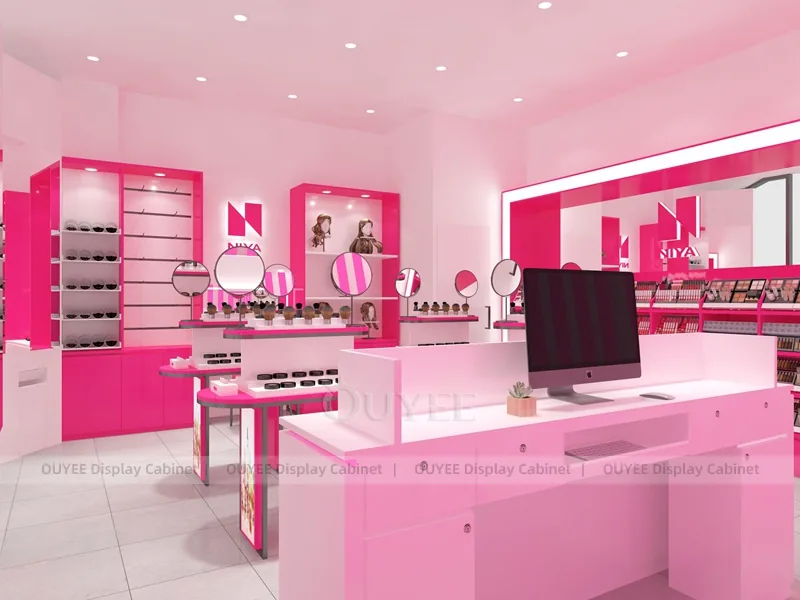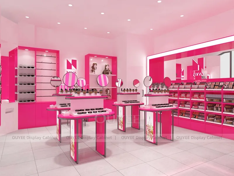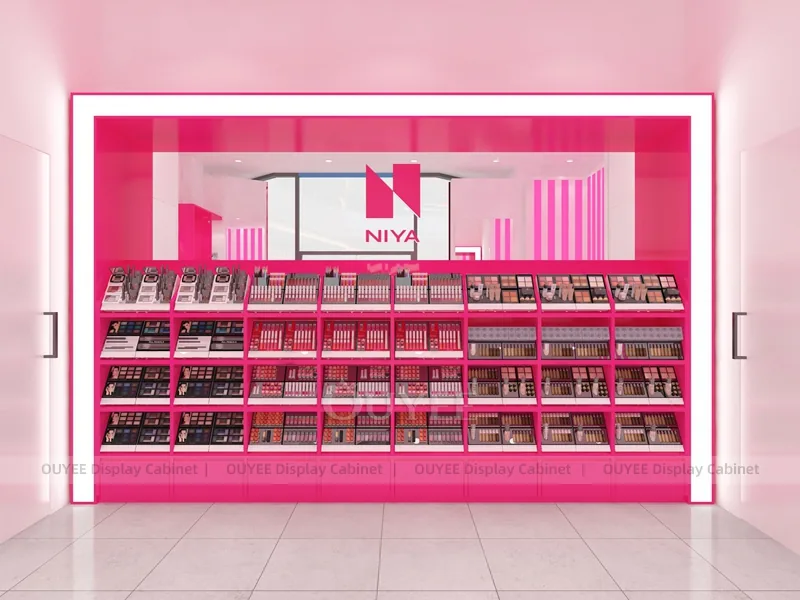 This configuration works well for cosmetic shops, makeup boutiques, beauty chain stores, department-store counters, and branded retail interiors. It is suitable for cosmetic store openings, beauty shop renovations, department-store counter upgrades, pop-up retail projects, and custom display fixture programs that need consistent production quality.