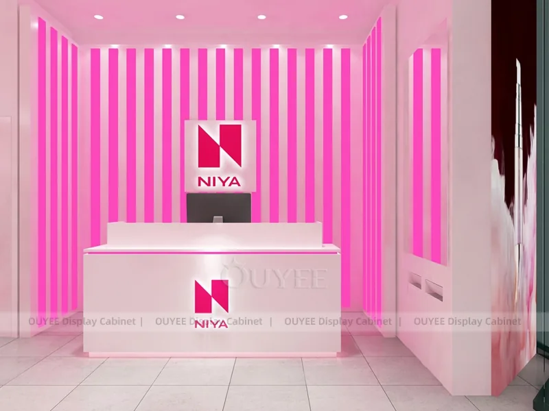 OUYEE can produce this model with custom color retail panels, durable shelving, metal supports, acrylic accents, and integrated LED lighting. Dimensions, finish colors, shelf depths, light boxes, tester trays, logo panels, storage modules, and counter details can be adjusted to match the store plan and brand identity. Related inspiration is available across display shelves, wall display, display counter, and our store fixture manufacturing service.