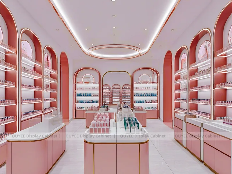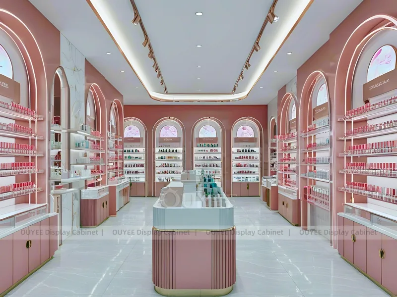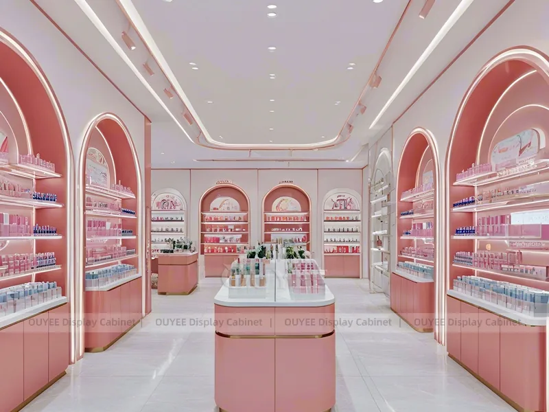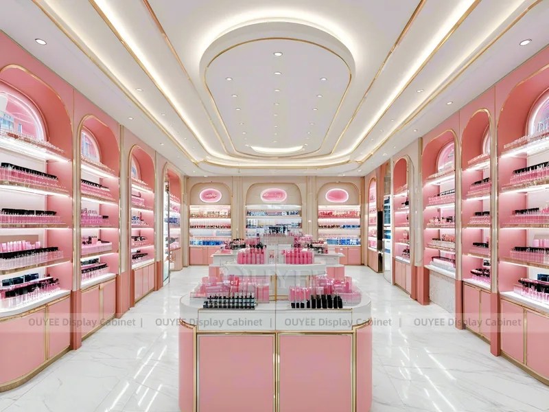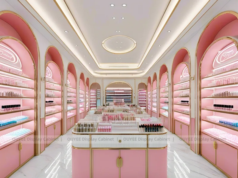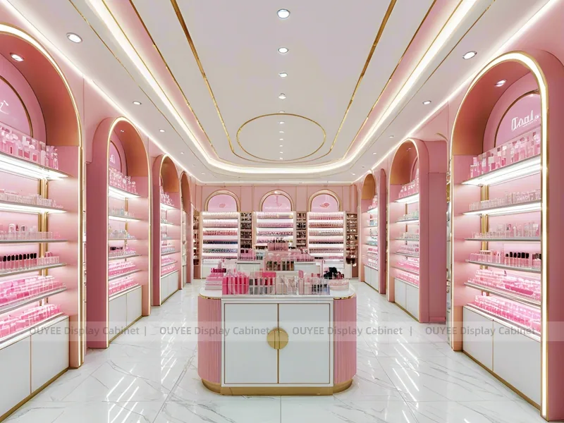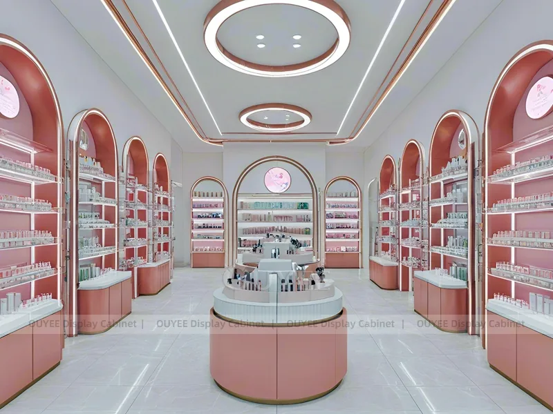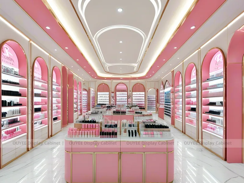 OUYEE develops the Pink Logo Island Display for beauty retailers that need clearer product zoning, stronger brand presentation, and reliable fixture production for commercial store projects.