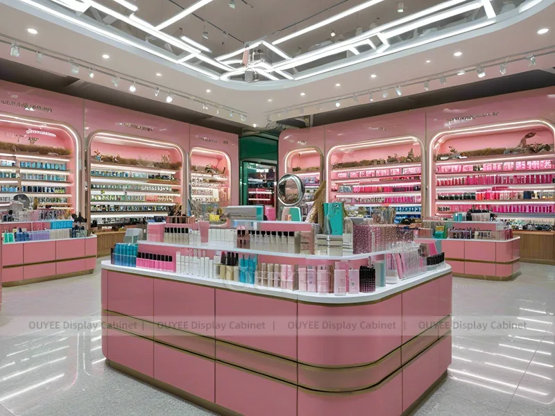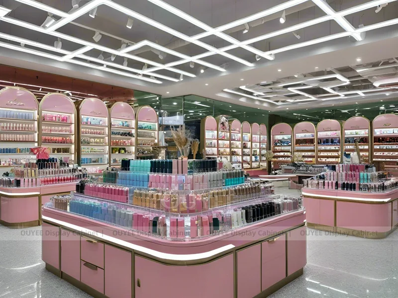 OUYEE can produce this model with custom color retail panels, durable shelving, metal supports, acrylic accents, and integrated LED lighting. Dimensions, finish colors, shelf depths, light boxes, tester trays, logo panels, storage modules, and counter details can be adjusted to match the store plan and brand identity. Related inspiration is available across display shelves, wall display, display counter, and our store fixture manufacturing service.