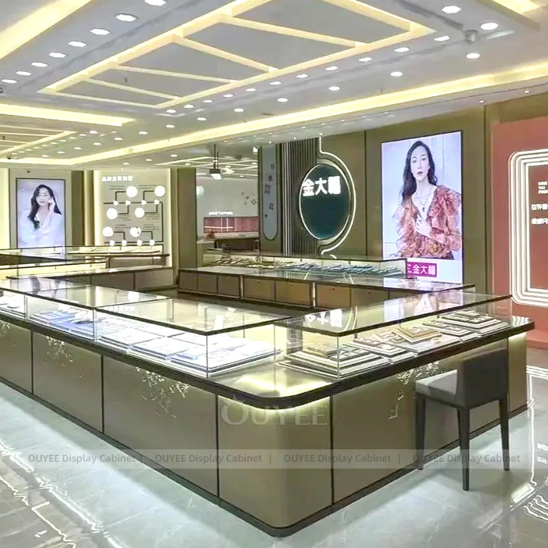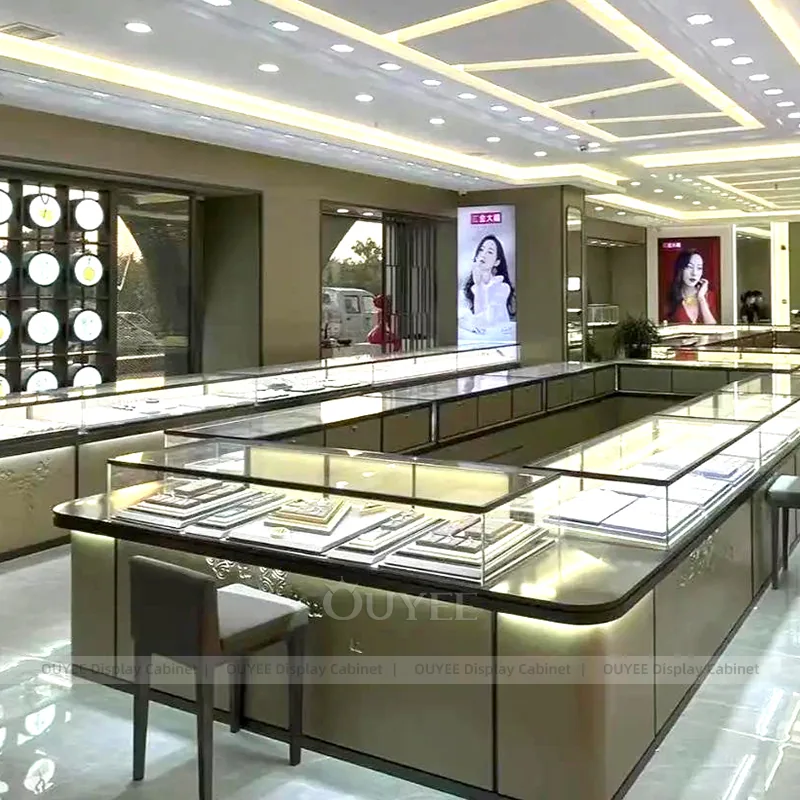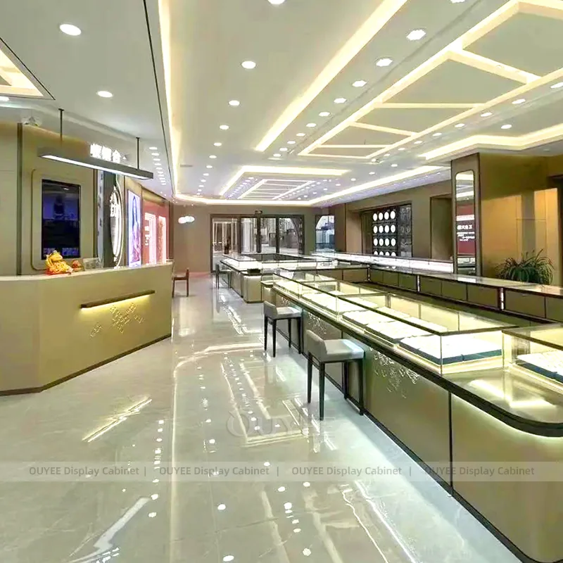 OUYEE can produce this model with tempered glass, lacquered display panels, and custom jewelry fixture joinery. We can adjust dimensions, counter heights, storage details, showcase proportions, branding areas, and soft cream finishes so the project fits the store concept, SKU mix, and floor plan. Related inspiration is available across jewelry shop displays, display cabinet and our store fixture manufacturing service.