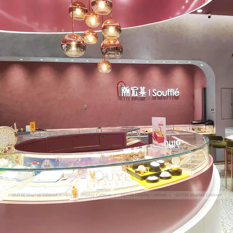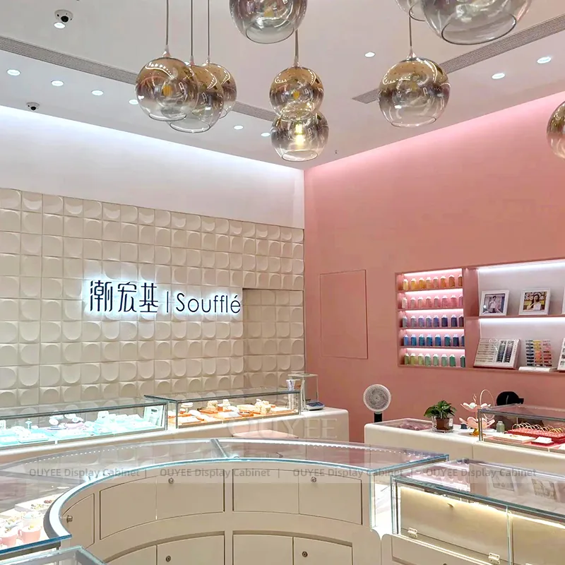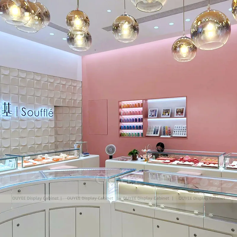 OUYEE can produce this model with tempered glass, fluted wood cladding, and custom jewelry fixture joinery. We can adjust dimensions, counter heights, storage details, showcase proportions, branding areas, and fluted wood textures so the project fits the store concept, SKU mix, and floor plan. Related inspiration is available across jewelry shop displays, display cabinet and our store fixture manufacturing service.