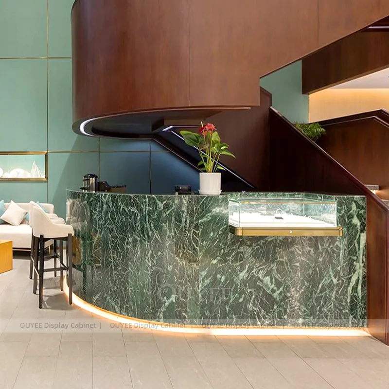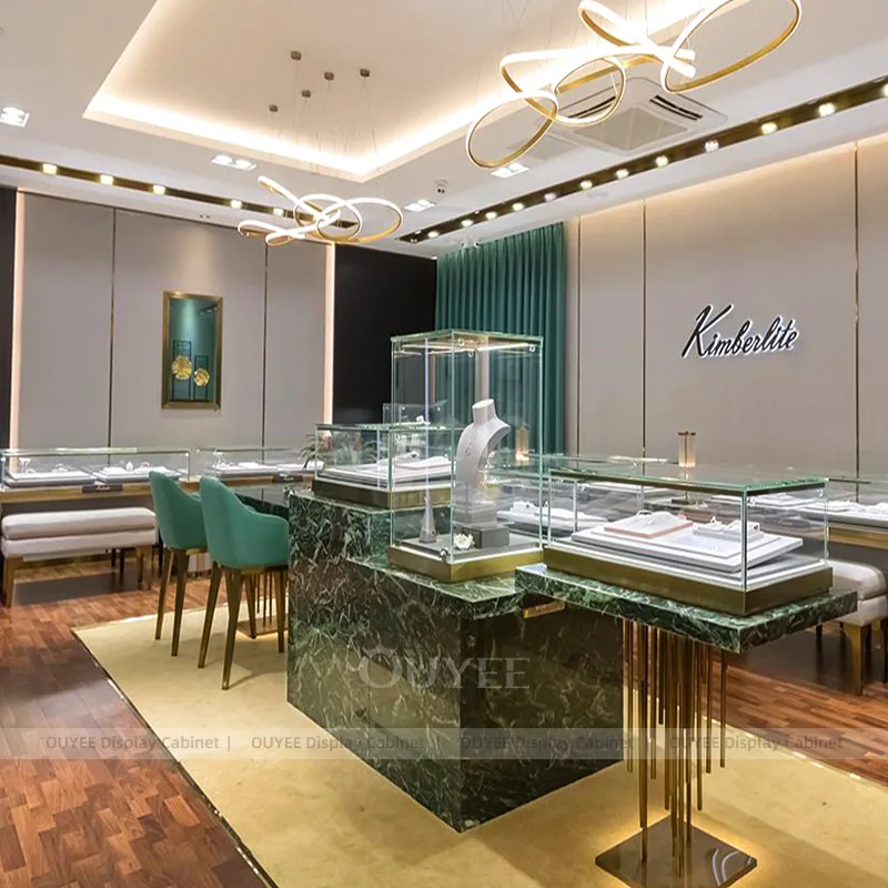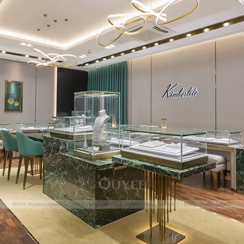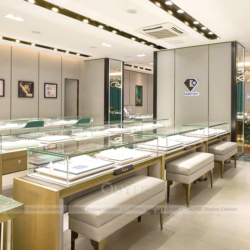 OUYEE can produce this model with tempered glass, lacquered display panels, and custom jewelry fixture joinery. We can adjust dimensions, counter heights, storage details, showcase proportions, branding areas, and clean white finishes so the project fits the store concept, SKU mix, and floor plan. Related inspiration is available across jewelry shop displays, display cabinet and our store fixture manufacturing service.