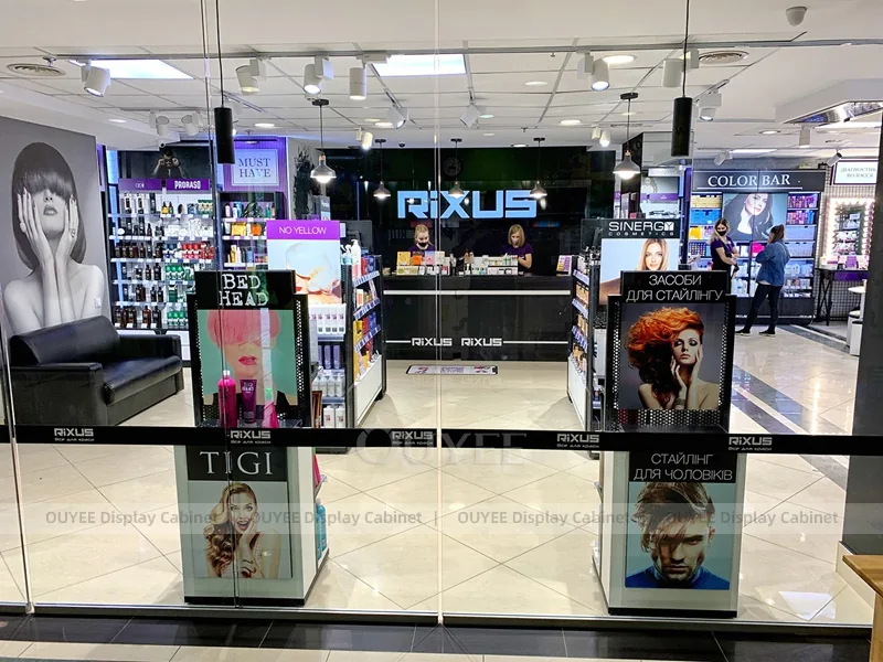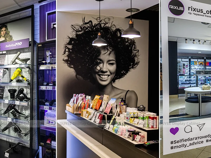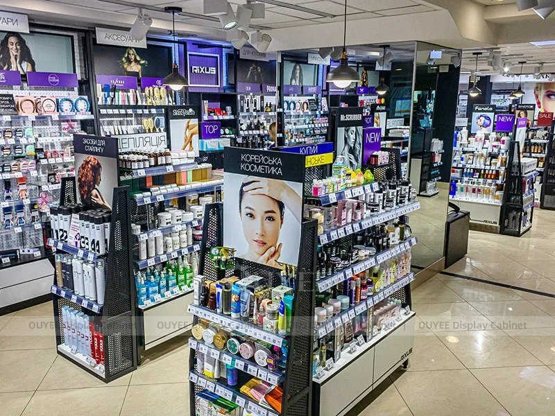 OUYEE can produce this model with custom color retail panels, durable shelving, metal supports, acrylic accents, and integrated LED lighting. Dimensions, finish colors, shelf depths, light boxes, tester trays, logo panels, storage modules, and counter details can be adjusted to match the store plan and brand identity. Related inspiration is available across display shelves, wall display, display counter, and our store fixture manufacturing service.