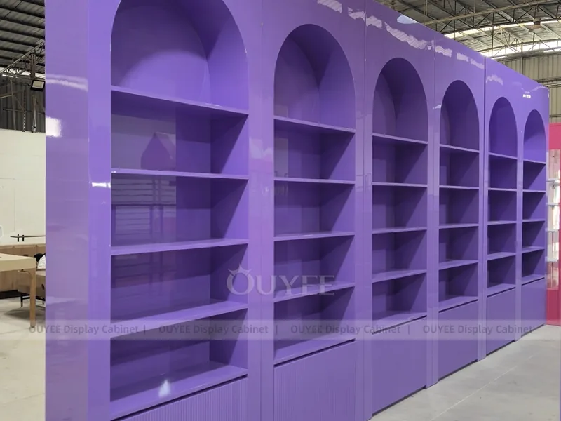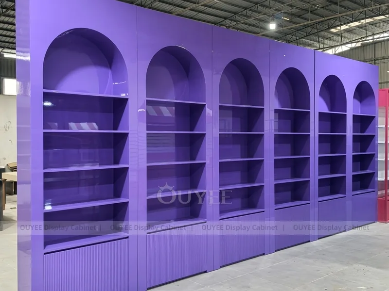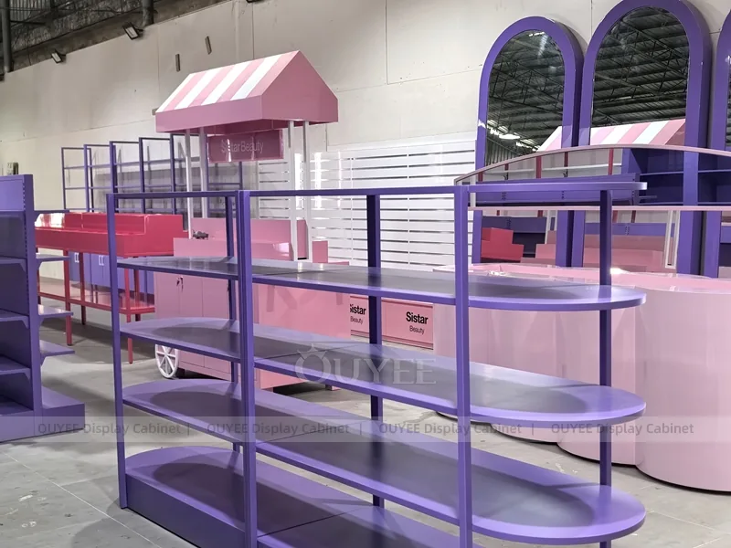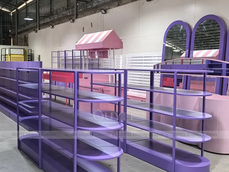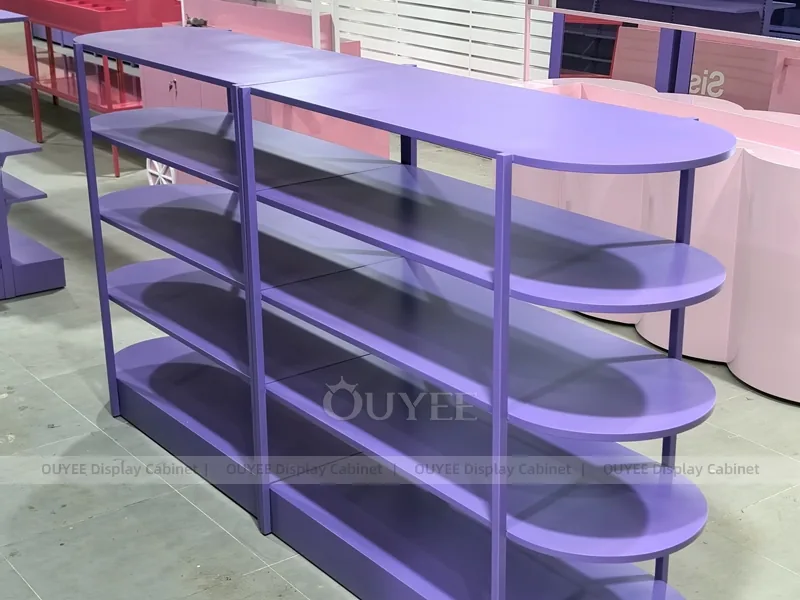 The Purple Rounded Gondola Display is built for cosmetic shops, makeup boutiques, beauty chain stores, department-store counters, and branded retail interiors. It helps retailers present makeup, skincare, fragrance, testers, beauty tools, and promotional retail collections with a cleaner visual story and more practical daily merchandising control.