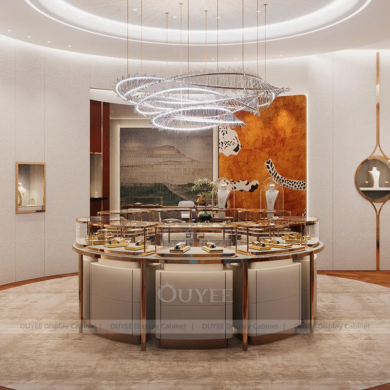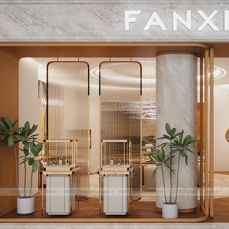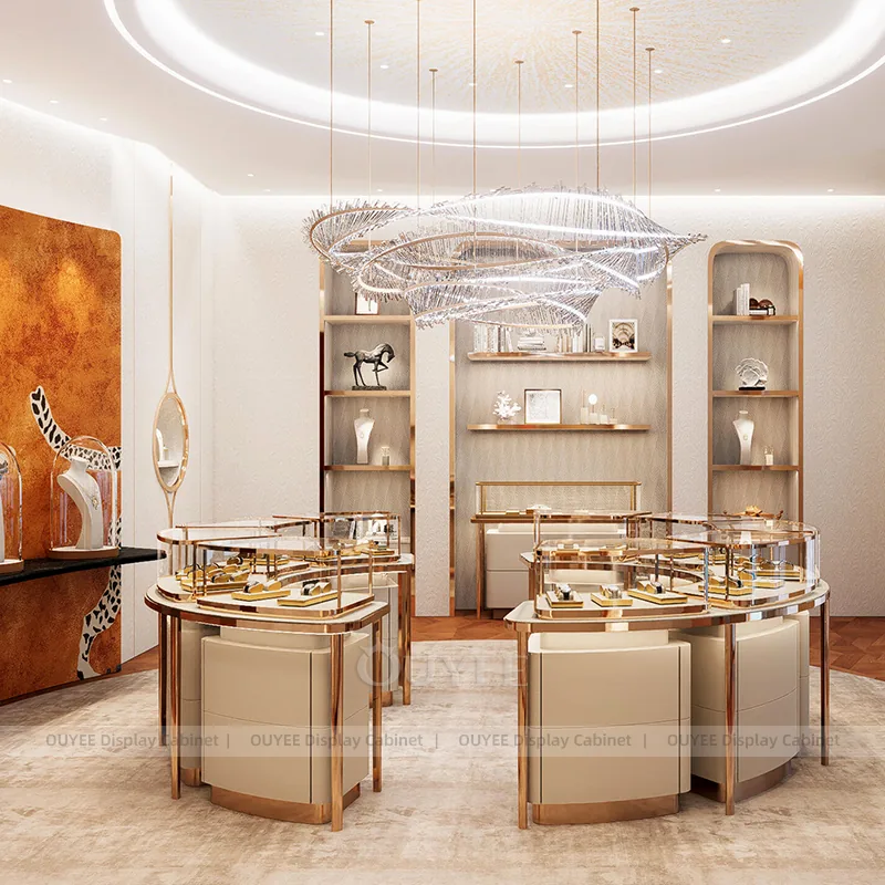 OUYEE can produce this model with tempered glass, lacquered display panels, and custom jewelry fixture joinery. We can adjust dimensions, counter heights, storage details, showcase proportions, branding areas, and warm beige finishes so the project fits the store concept, SKU mix, and floor plan. Related inspiration is available across jewelry shop displays, display cases and our store fixture manufacturing service.