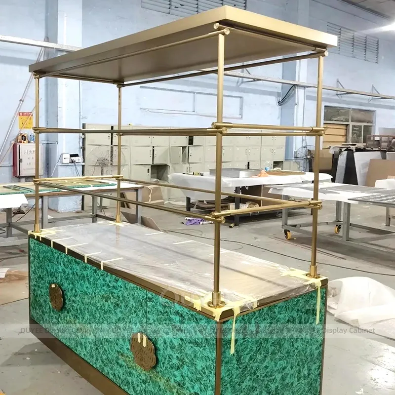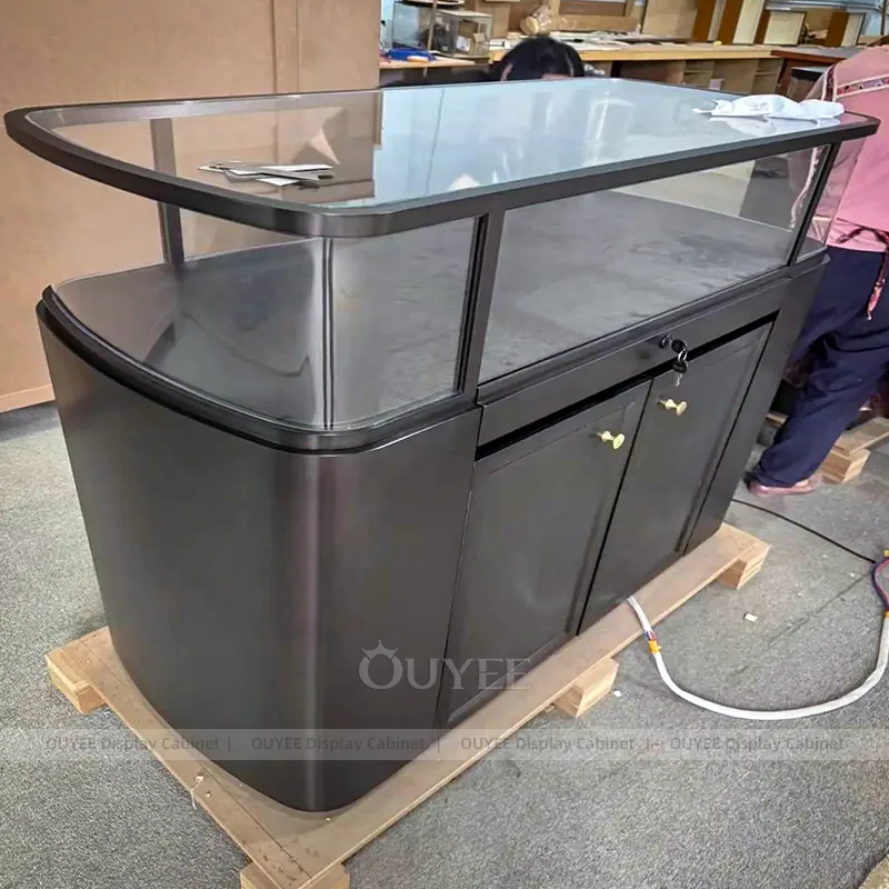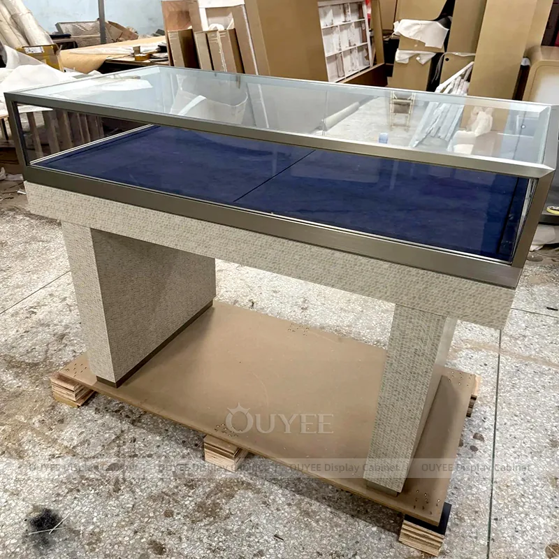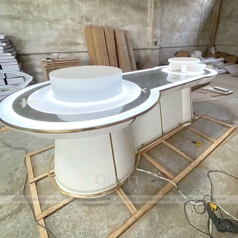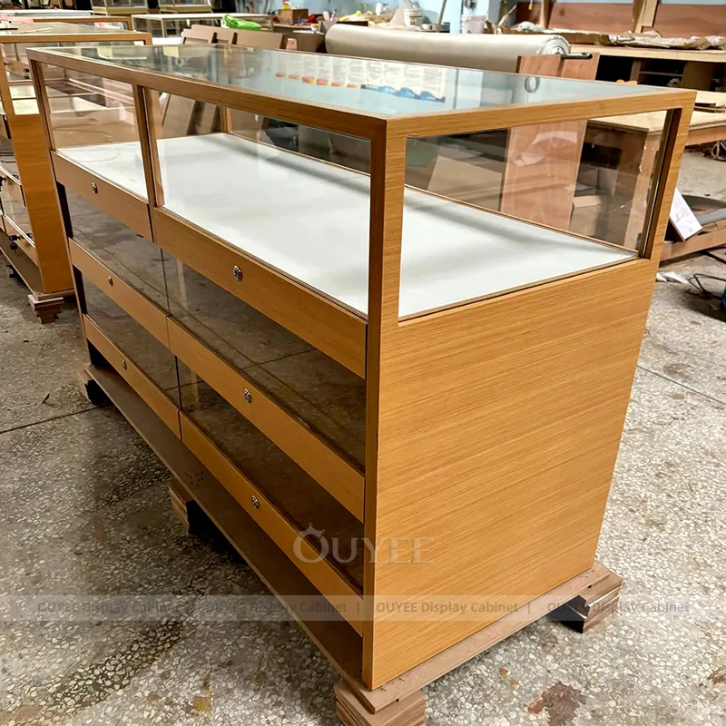 OUYEE can produce this model with tempered glass, lacquered display panels, and custom jewelry fixture joinery. We can adjust dimensions, counter heights, storage details, showcase proportions, branding areas, and soft cream finishes so the project fits the store concept, SKU mix, and floor plan. Related inspiration is available across jewelry shop displays, display cases and our store fixture manufacturing service.