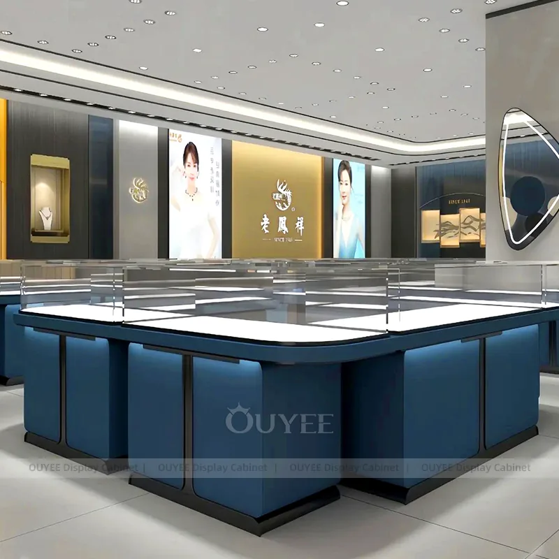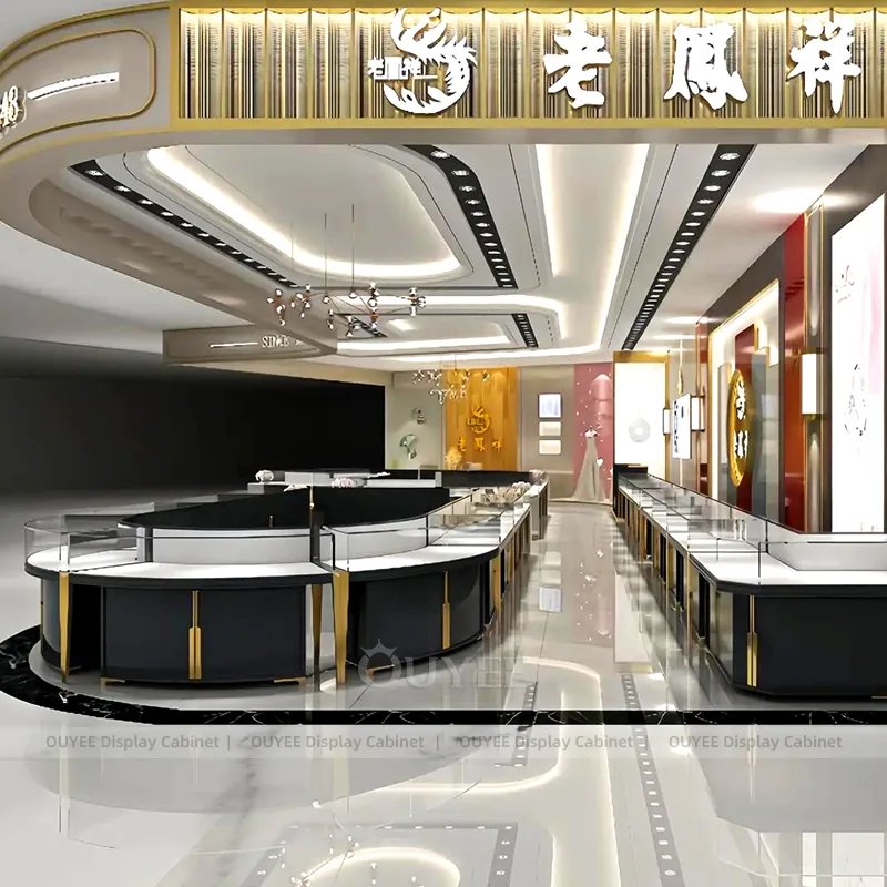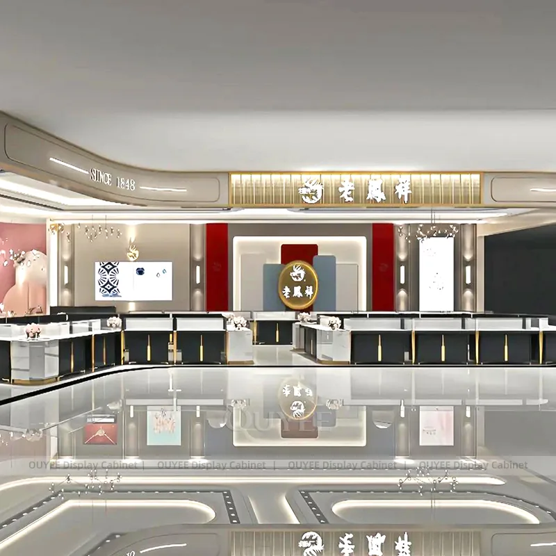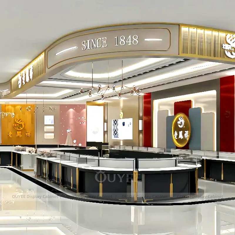 OUYEE can produce this model with tempered glass, lacquered display panels, and custom jewelry fixture joinery. We can adjust dimensions, counter heights, storage details, showcase proportions, branding areas, and soft cream finishes so the project fits the store concept, SKU mix, and floor plan. Related inspiration is available across jewelry shop displays, display cabinet and our store fixture manufacturing service.