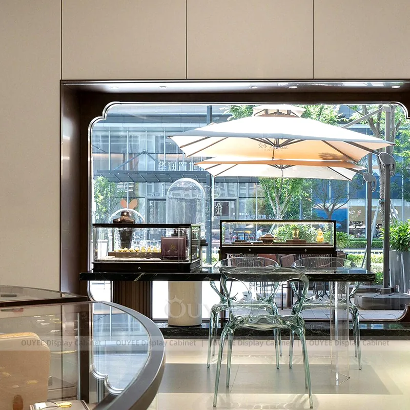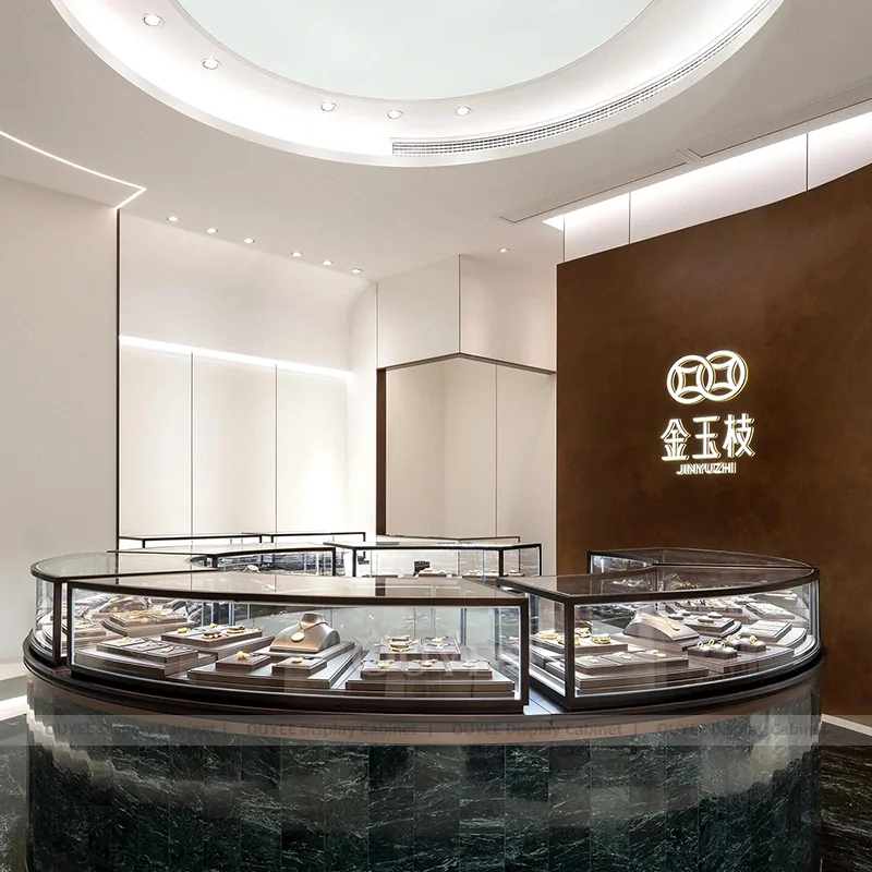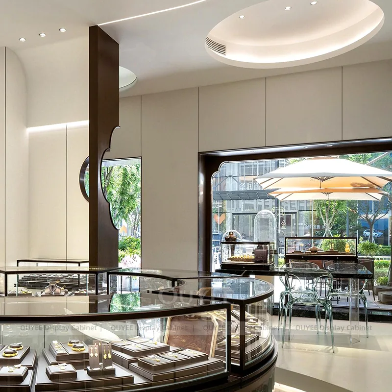 OUYEE can produce this model with tempered glass, lacquered display panels, and custom jewelry fixture joinery. We can adjust dimensions, counter heights, storage details, showcase proportions, branding areas, and soft cream finishes so the project fits the store concept, SKU mix, and floor plan. Related inspiration is available across jewelry shop displays, display cases and our store fixture manufacturing service.