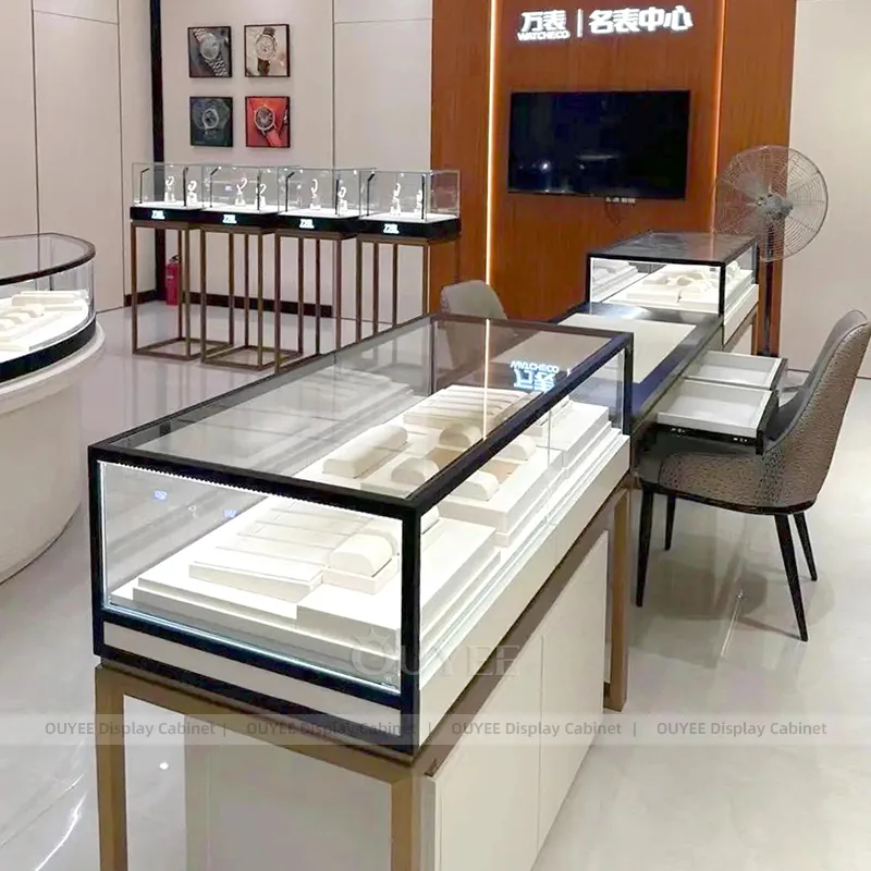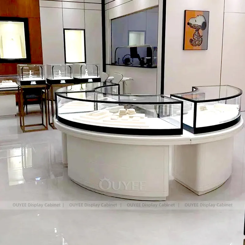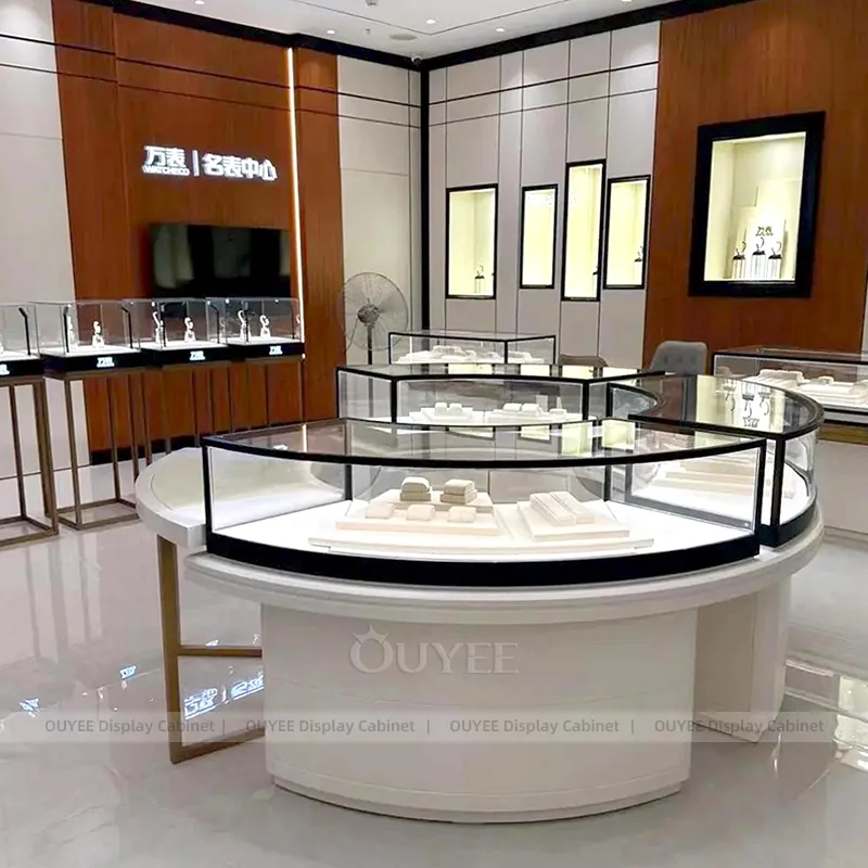 OUYEE can produce this model with tempered glass, fluted wood cladding, and custom jewelry fixture joinery. We can adjust dimensions, counter heights, storage details, showcase proportions, branding areas, and fluted wood textures so the project fits the store concept, SKU mix, and floor plan. Related inspiration is available across jewelry shop displays, display cases and our store fixture manufacturing service.