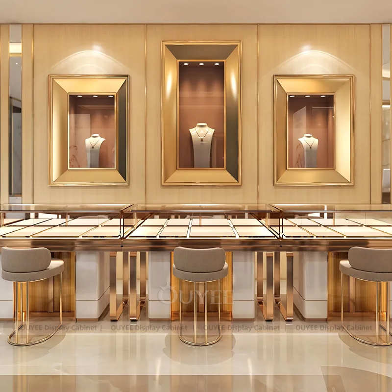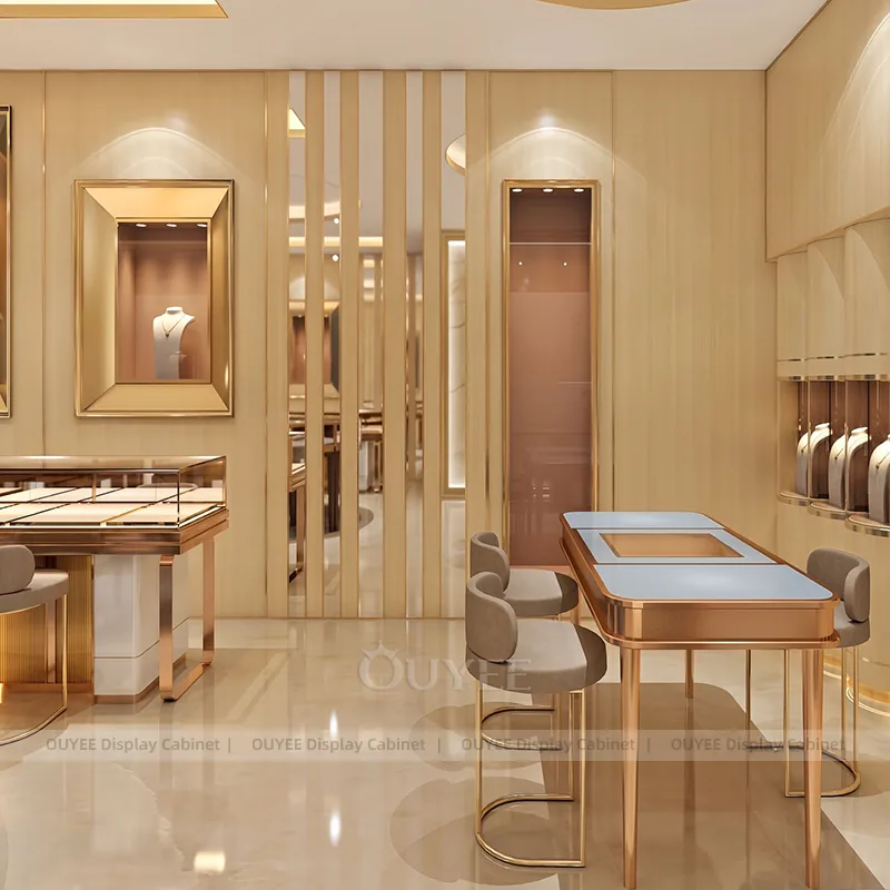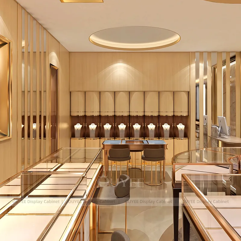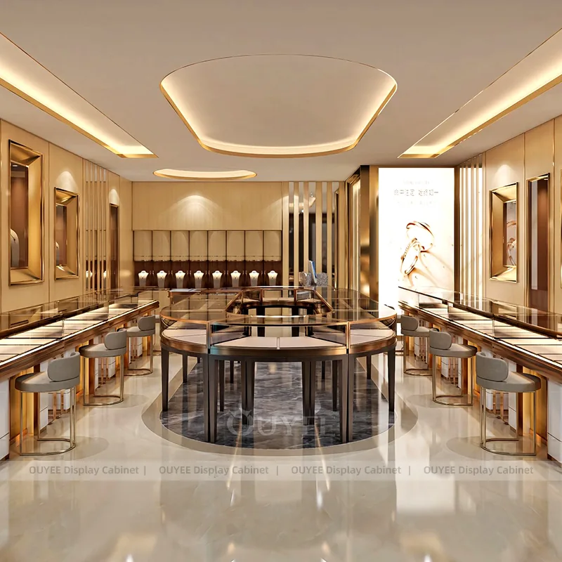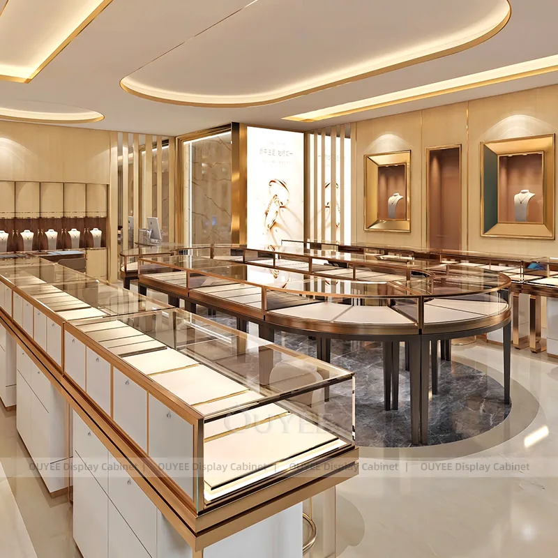 OUYEE can produce this model with tempered glass, fluted wood cladding, and custom jewelry fixture joinery. We can adjust dimensions, counter heights, storage details, showcase proportions, branding areas, and fluted wood textures so the project fits the store concept, SKU mix, and floor plan. Related inspiration is available across jewelry shop displays, display cabinet and our store fixture manufacturing service.
