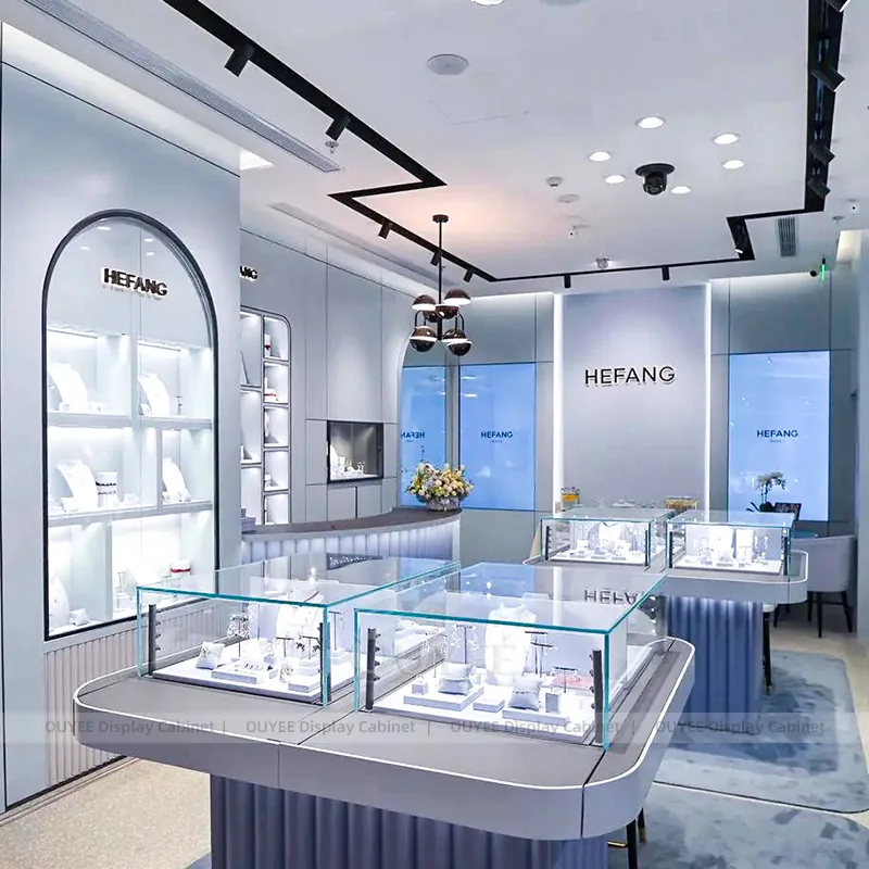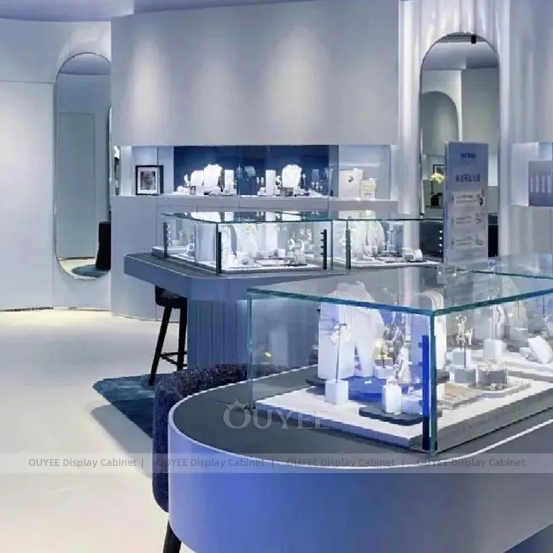 OUYEE can produce this model with tempered glass, marble-look accent panels, and custom jewelry fixture joinery. We can adjust dimensions, counter heights, storage details, showcase proportions, branding areas, and marble-accent detailing so the project fits the store concept, SKU mix, and floor plan. Related inspiration is available across jewelry shop displays, display cases and our store fixture manufacturing service.