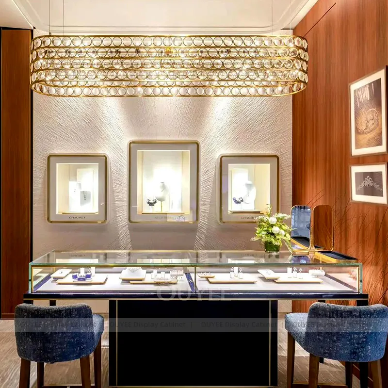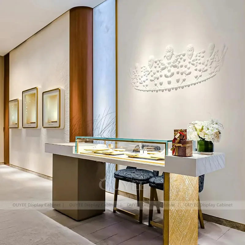 OUYEE can produce this model with tempered glass, marble-look accent panels, and custom jewelry fixture joinery. We can adjust dimensions, counter heights, storage details, showcase proportions, branding areas, and marble-accent detailing so the project fits the store concept, SKU mix, and floor plan. Related inspiration is available across jewelry shop displays, display cabinet and our store fixture manufacturing service.