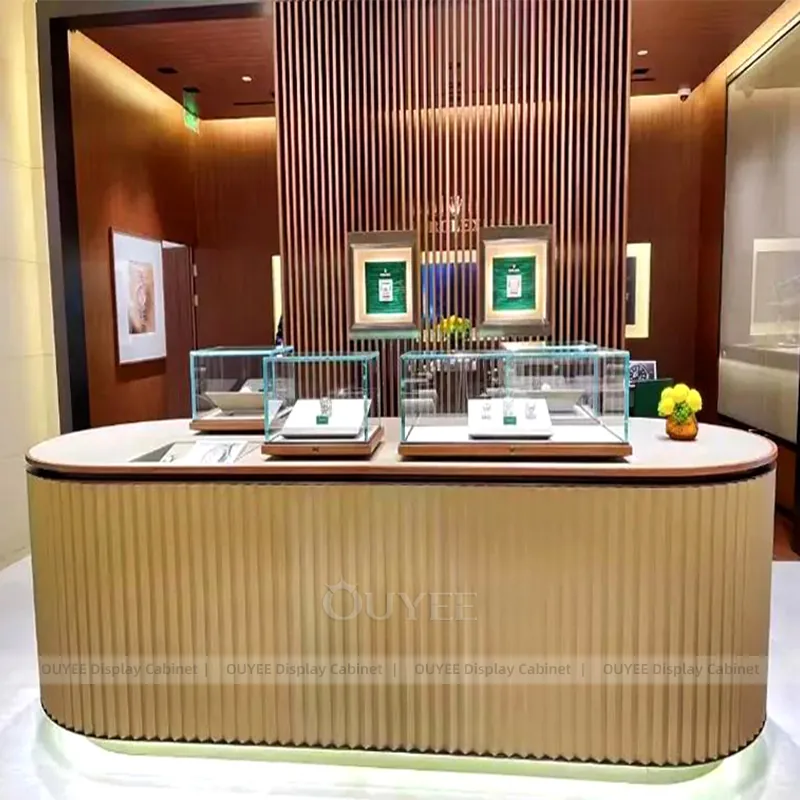 OUYEE can produce this model with tempered glass, lacquered display panels, and custom jewelry fixture joinery. We can adjust dimensions, counter heights, storage details, showcase proportions, branding areas, and clean white finishes so the project fits the store concept, SKU mix, and floor plan. Related inspiration is available across jewelry shop displays, display cases and our store fixture manufacturing service.