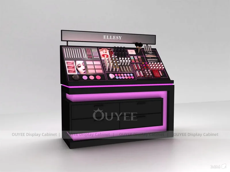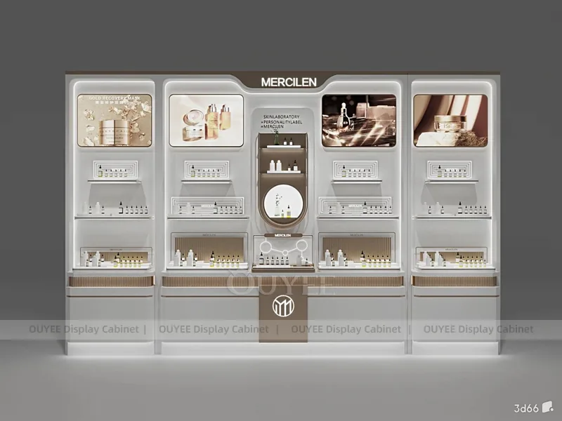 This configuration works well for cosmetic shops, makeup boutiques, beauty chain stores, department-store counters, and branded retail interiors. It is suitable for cosmetic store openings, beauty shop renovations, department-store counter upgrades, pop-up retail projects, and custom display fixture programs that need consistent production quality.