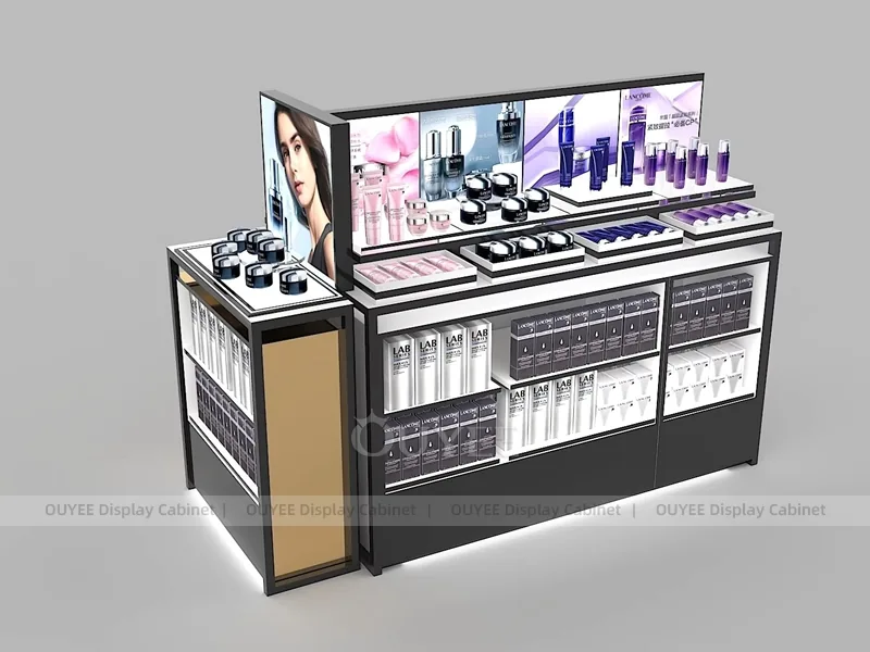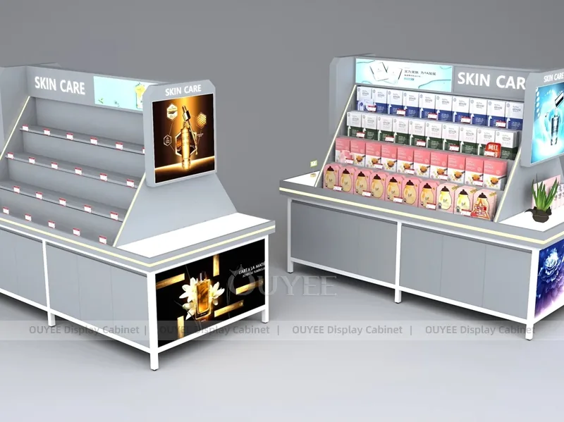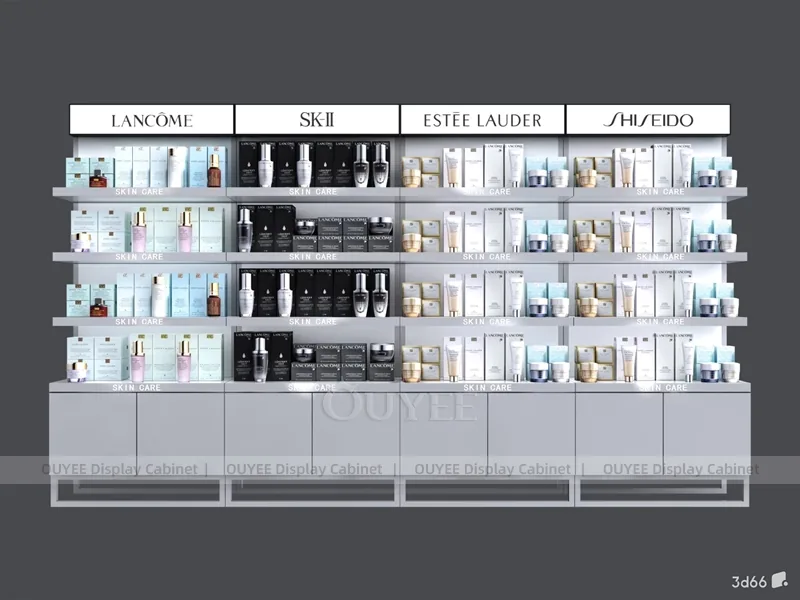 OUYEE can produce this model with commercial display panels, durable metal supports, tempered glass options, acrylic details, and integrated LED lighting. Dimensions, finish colors, shelf depths, light boxes, tester trays, logo panels, storage modules, and counter details can be adjusted to match the store plan and brand identity. Related inspiration is available across display shelves, wall display, display counter, and our store fixture manufacturing service.