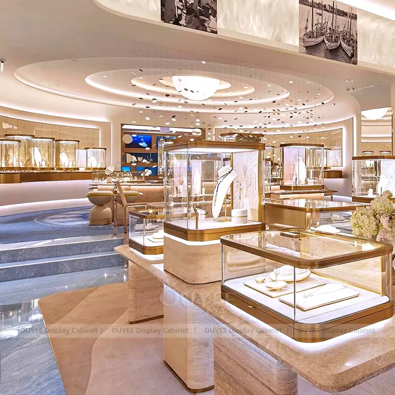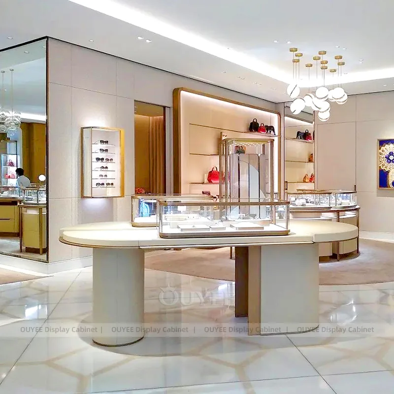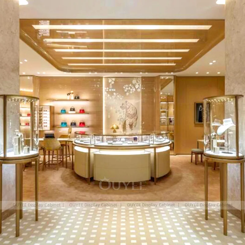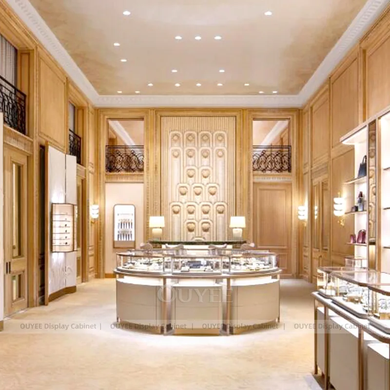OUYEE can produce this model with tempered glass, lacquered display panels, and custom jewelry fixture joinery. We can adjust dimensions, counter heights, storage details, showcase proportions, branding areas, and warm beige finishes so the project fits the store concept, SKU mix, and floor plan. Related inspiration is available across jewelry shop displays, display cabinet and our store fixture manufacturing service.