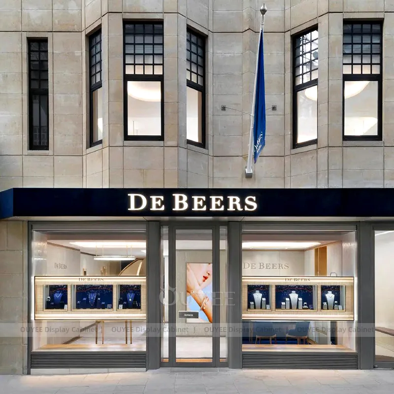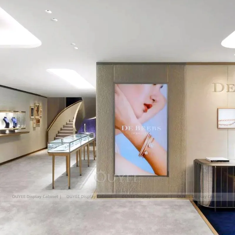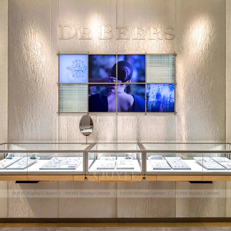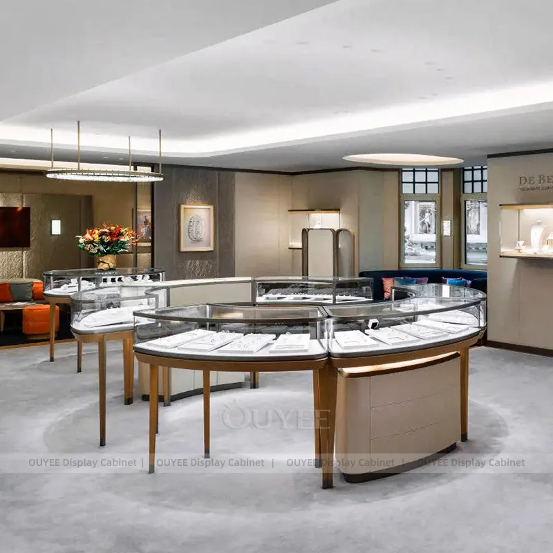 OUYEE can produce this model with tempered glass, champagne-gold metal trim, and custom jewelry fixture joinery. We can adjust dimensions, counter heights, storage details, showcase proportions, branding areas, and champagne-gold detailing so the project fits the store concept, SKU mix, and floor plan. Related inspiration is available across jewelry shop displays, display cabinet and our store fixture manufacturing service.