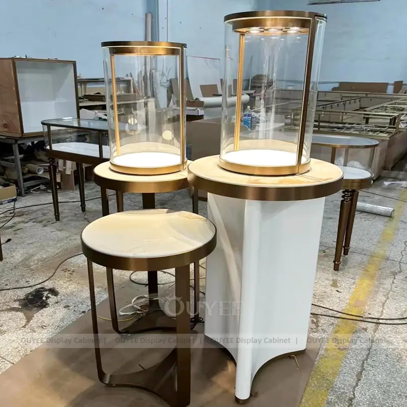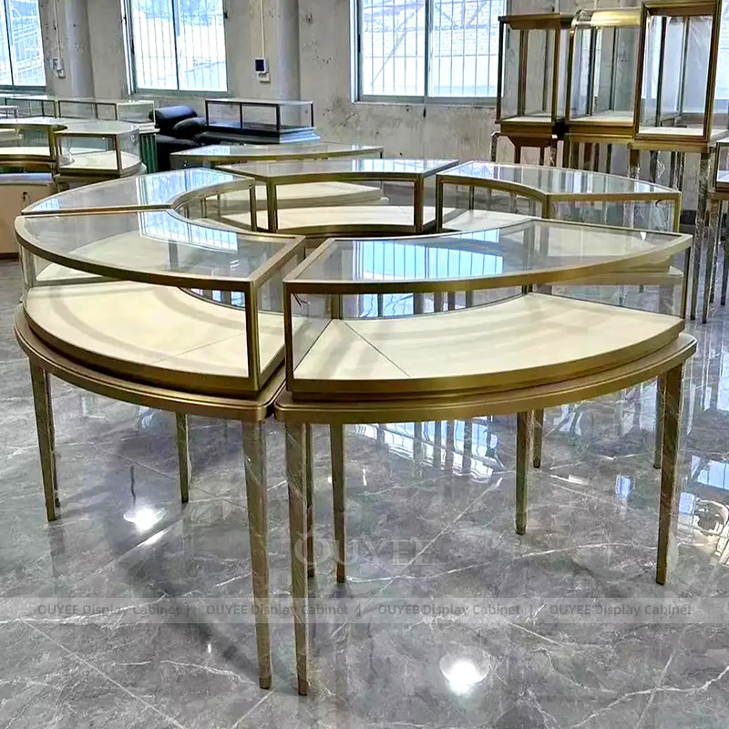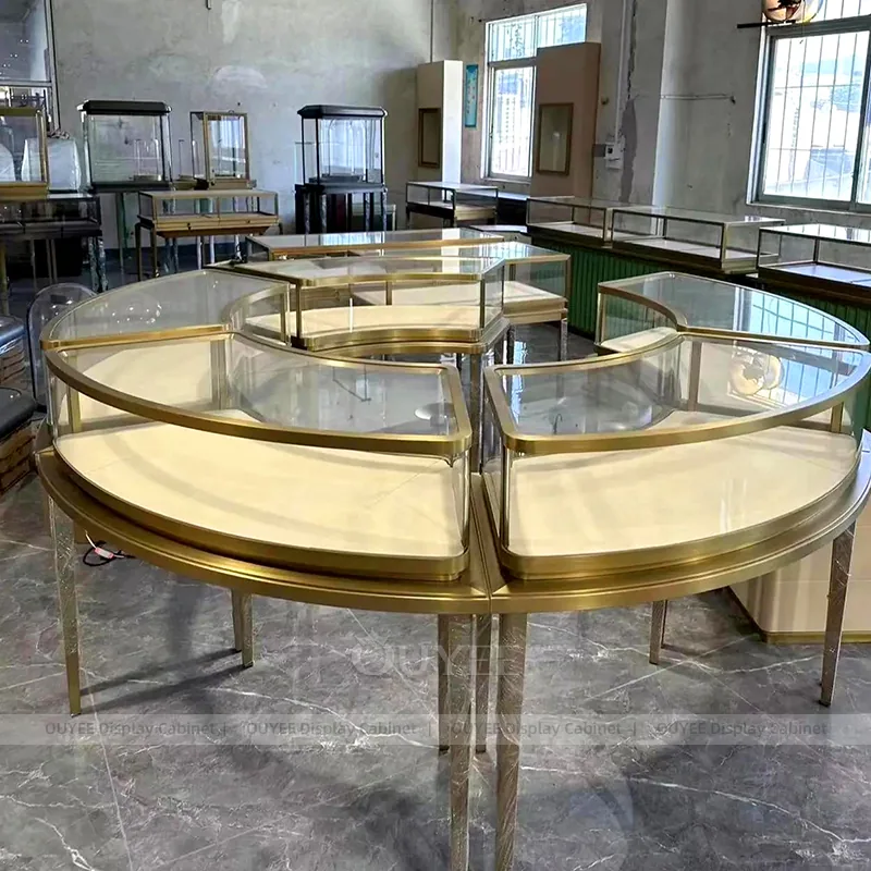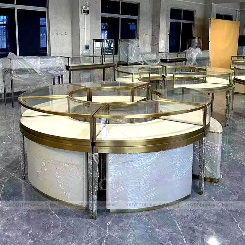 OUYEE can produce this model with tempered glass, marble-look accent panels, and custom jewelry fixture joinery. We can adjust dimensions, counter heights, storage details, showcase proportions, branding areas, and marble-accent detailing so the project fits the store concept, SKU mix, and floor plan. Related inspiration is available across jewelry shop displays, display cabinet and our store fixture manufacturing service.