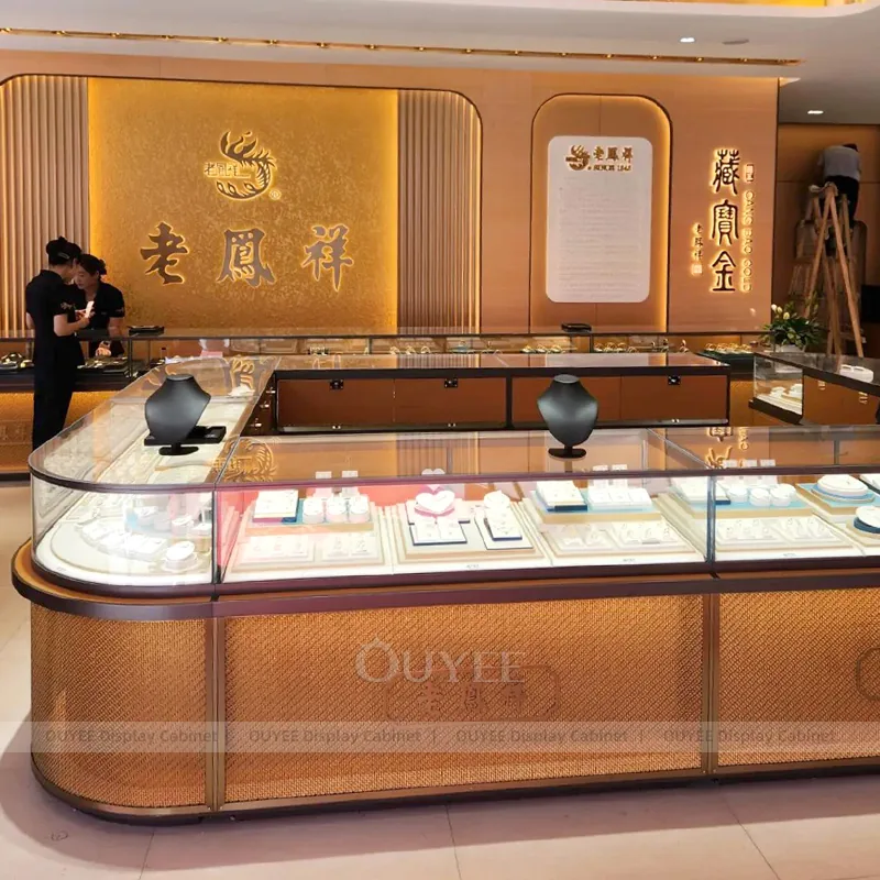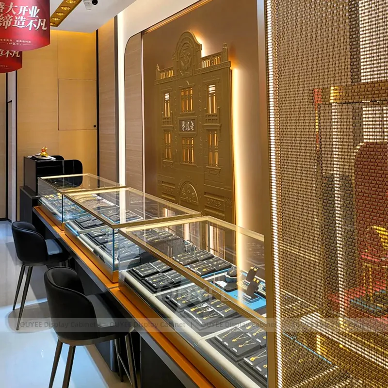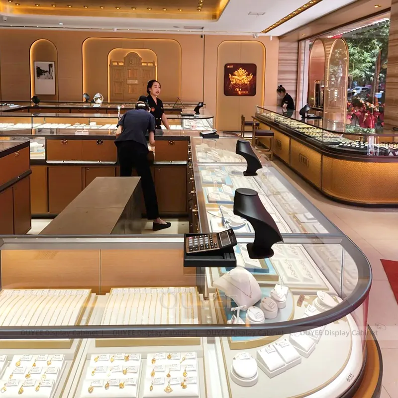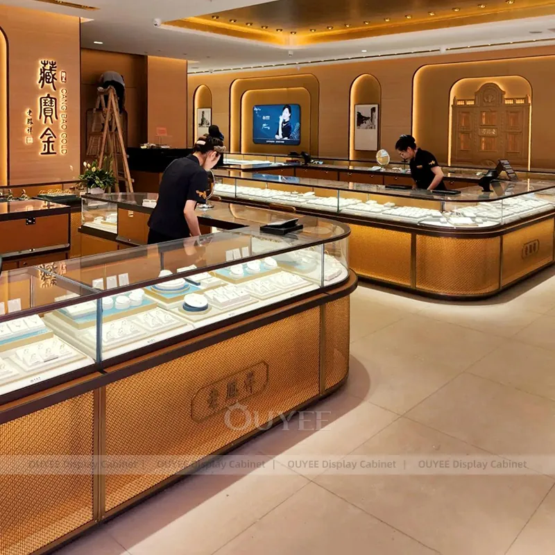 OUYEE can produce this model with tempered glass, walnut veneer cabinetry, and custom jewelry fixture joinery. We can adjust dimensions, counter heights, storage details, showcase proportions, branding areas, and walnut wood tones so the project fits the store concept, SKU mix, and floor plan. Related inspiration is available across jewelry shop displays, display cases and our store fixture manufacturing service.