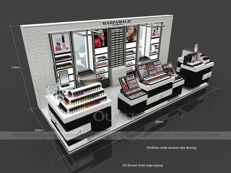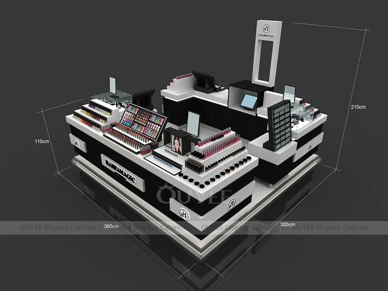 Designed as a cosmetic shop display solution, the Stepped Makeup Kiosk Display balances branded appearance, product capacity, customer browsing flow, and custom manufacturing flexibility.
