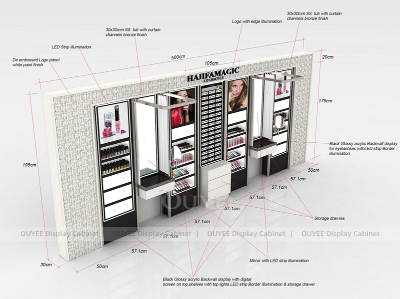 OUYEE can produce this model with commercial display panels, durable metal supports, tempered glass options, acrylic details, and integrated LED lighting. Dimensions, finish colors, shelf depths, light boxes, tester trays, logo panels, storage modules, and counter details can be adjusted to match the store plan and brand identity. Related inspiration is available across display shelves, wall display, display counter, and our store fixture manufacturing service.