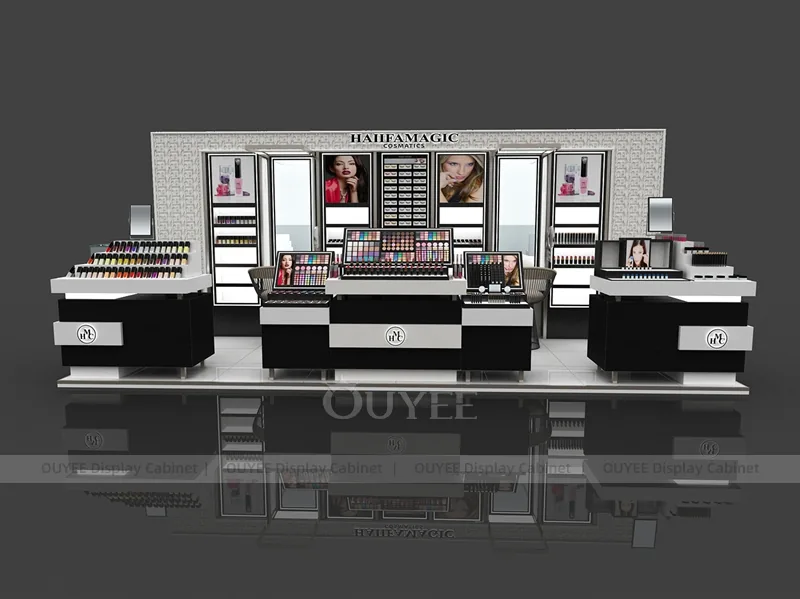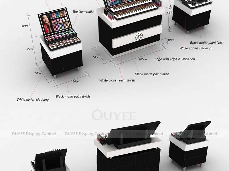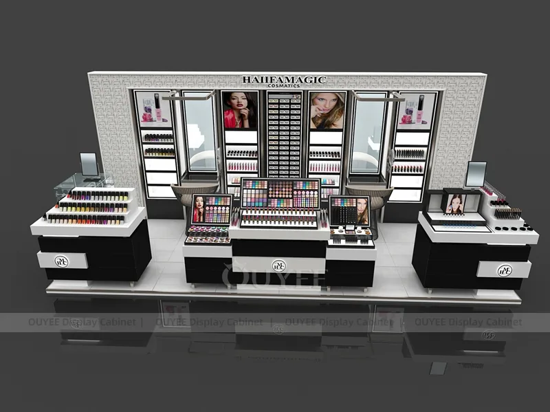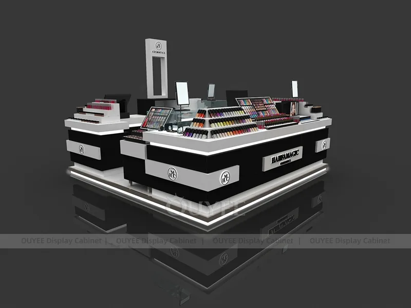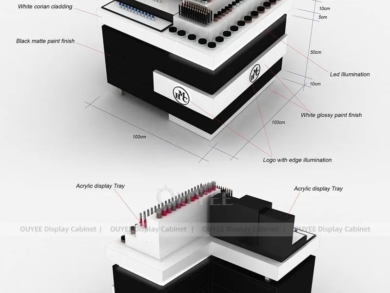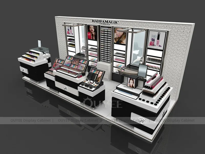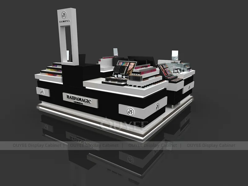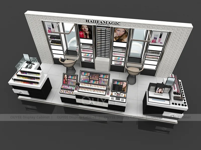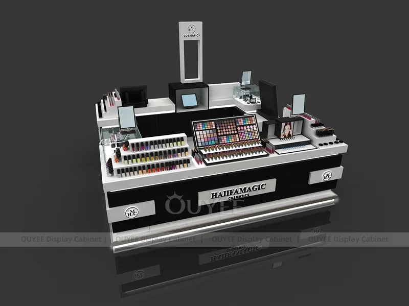 This configuration works well for mall beauty kiosks, cosmetic pop-up stores, brand activation areas, and compact retail spaces. It is suitable for cosmetic store openings, beauty shop renovations, department-store counter upgrades, pop-up retail projects, and custom display fixture programs that need consistent production quality.