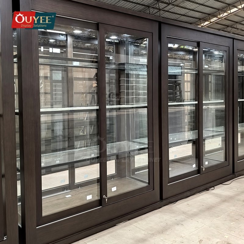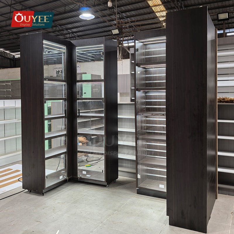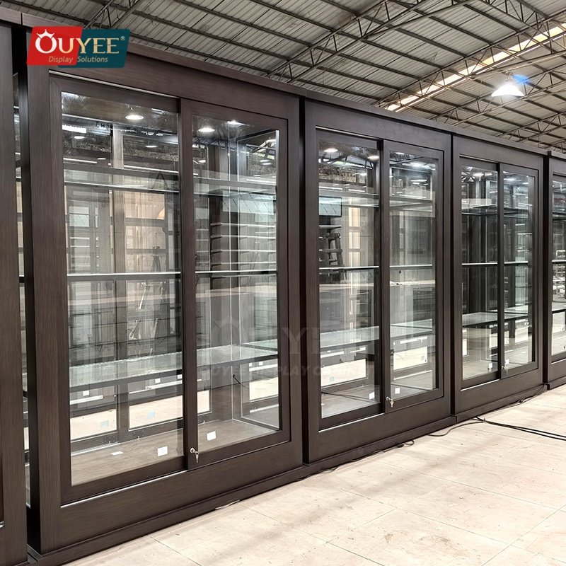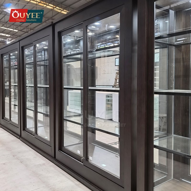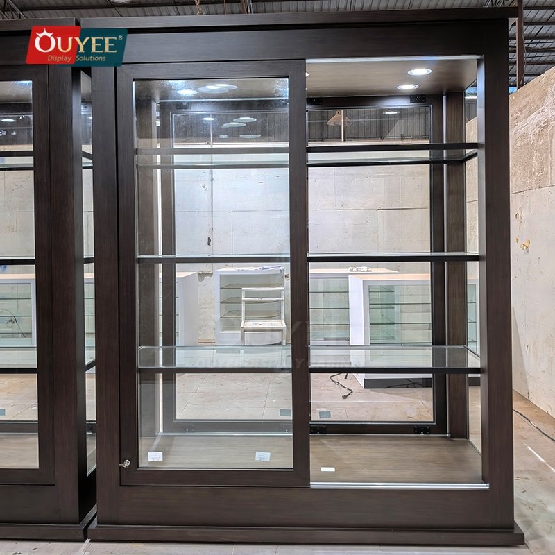 Built with tempered glass, and integrated LED lighting, this custom display solution is made for long-term commercial use. OUYEE can adjust cabinet dimensions, shelf positions, lighting temperature, finish tones, storage modules, and logo details to match different retail concepts. If your project also needs related showcase ideas, you can browse our glass display cabinet and display cases pages for more references.