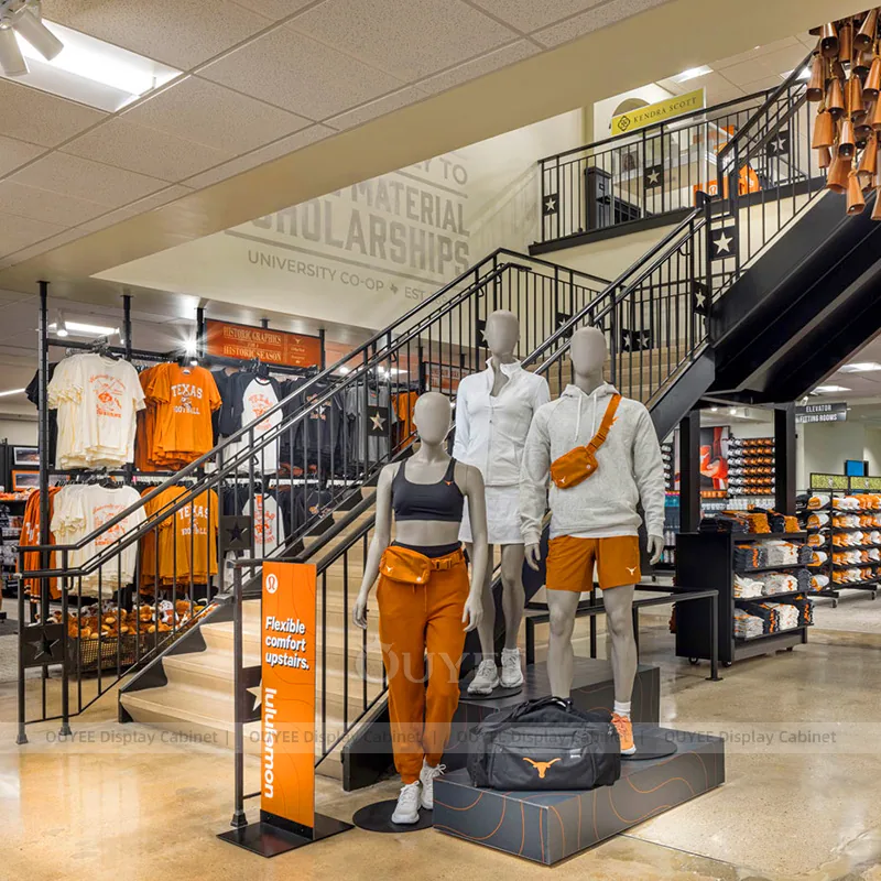 The University Team Stair Merchandising Display System is designed for stadium team stores, university fan shops, sports merchandise retailers, and branded event retail that need a stronger balance between merchandising capacity, shopper flow, and coordinated visual presentation across wall, floor, and focal display zones.