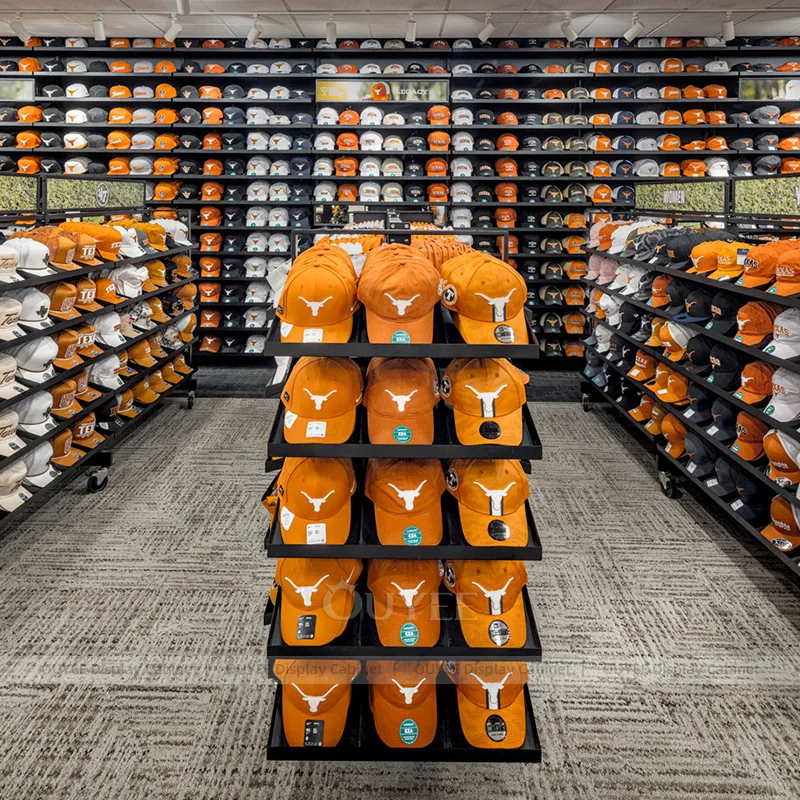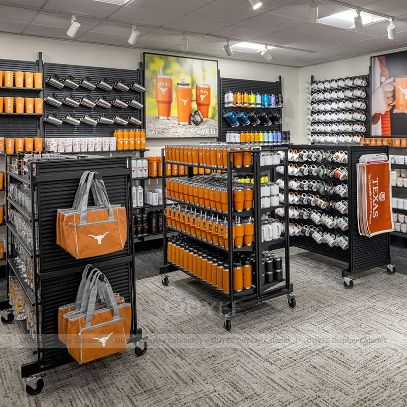This configuration works well for stadium team stores, university fan shops, sports merchandise retailers, and branded event retail. It is suitable for stores that want custom display hardware, more coherent fixture language, and a practical combination of feature presentation, everyday stock holding, and shopper-friendly access.