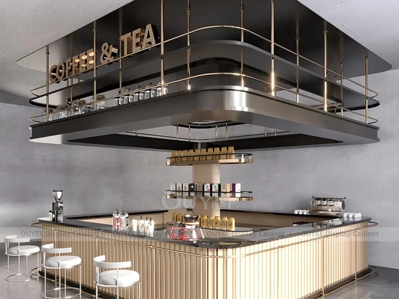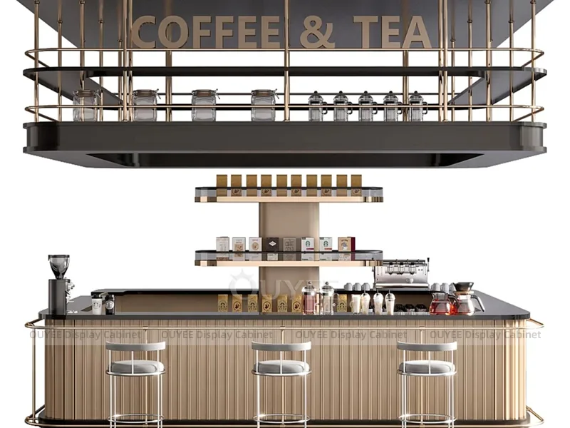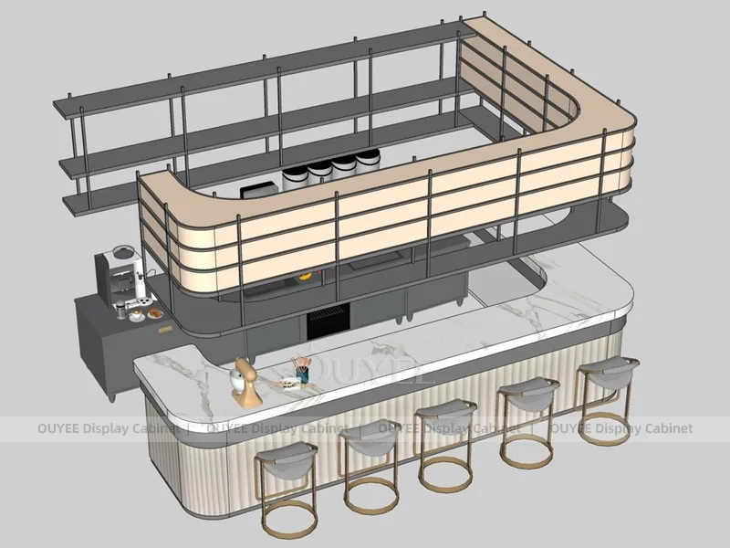 OUYEE can customize this model with durable counter and storage modules. Store owners can adjust size, finish, layout, logo panel, counter height, storage structure, service opening, pickup area, cup storage, equipment clearance, menu areas, cup storage, topping display, lighting position, counter depth, and brand logo details to match the final shop drawing.