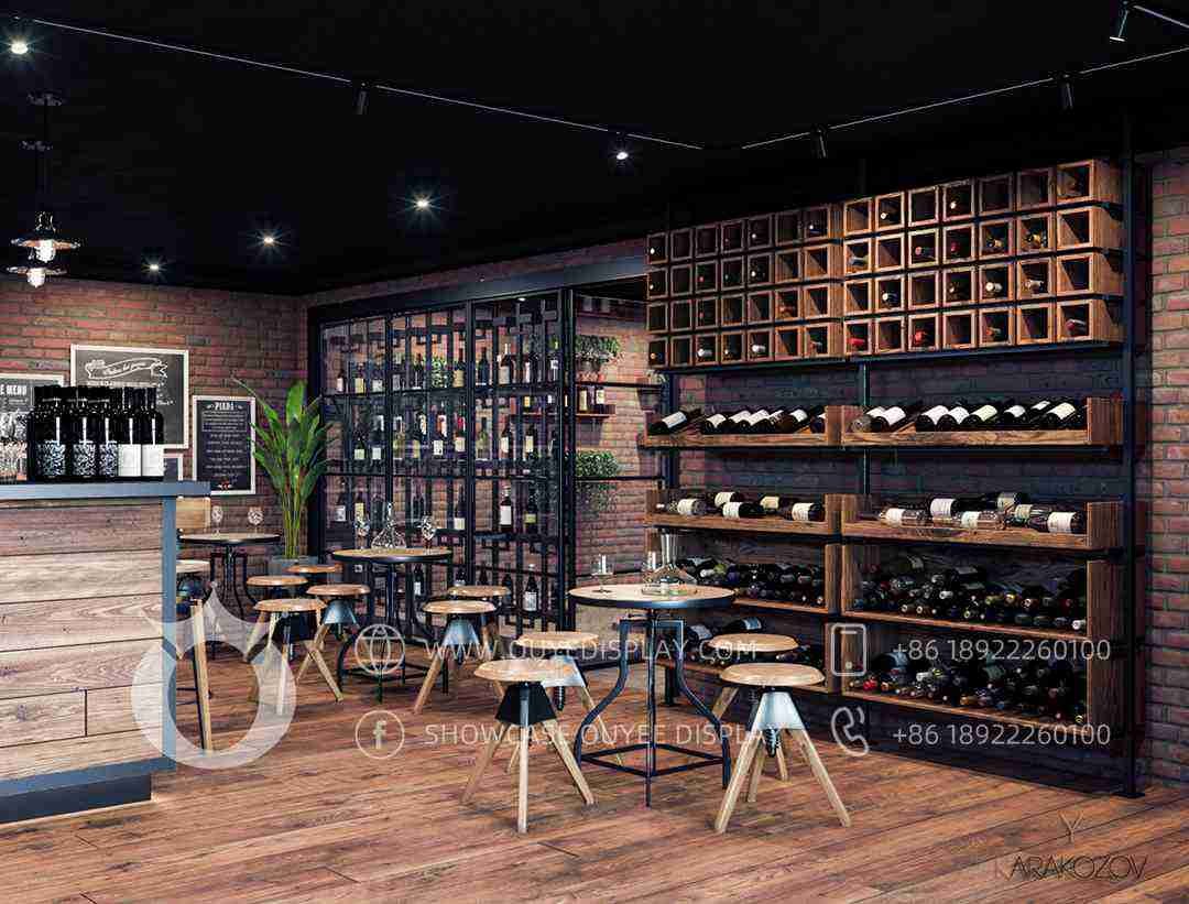 Wooden liquor display cabinet showcase classic wine bottle rack wine peg black metal black counter top