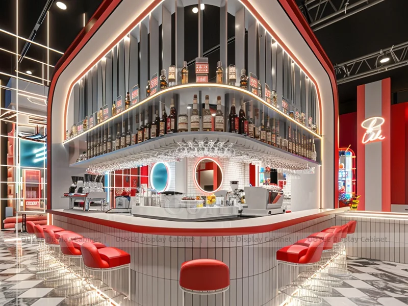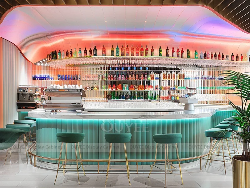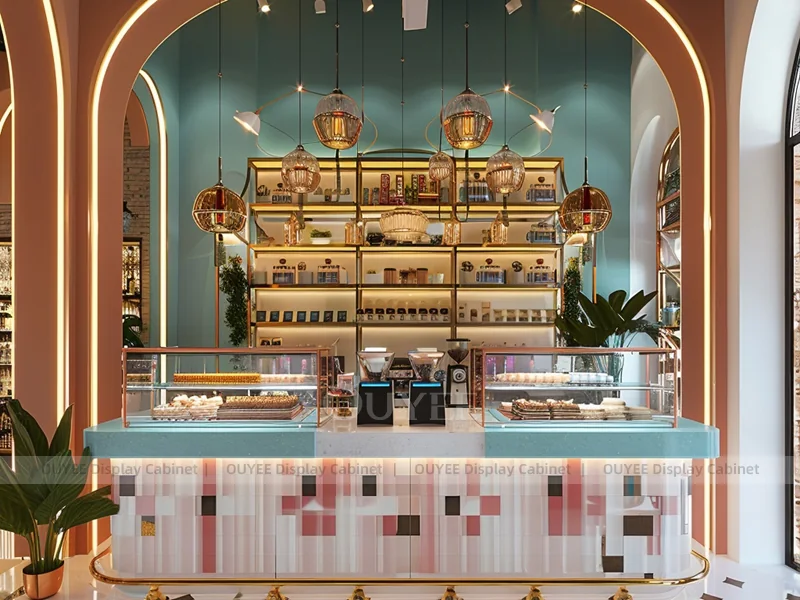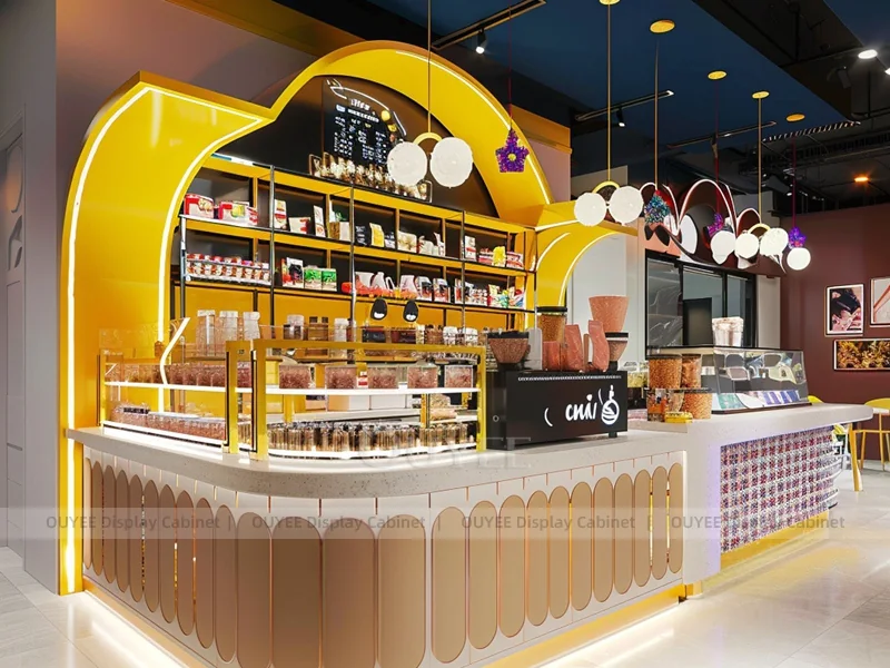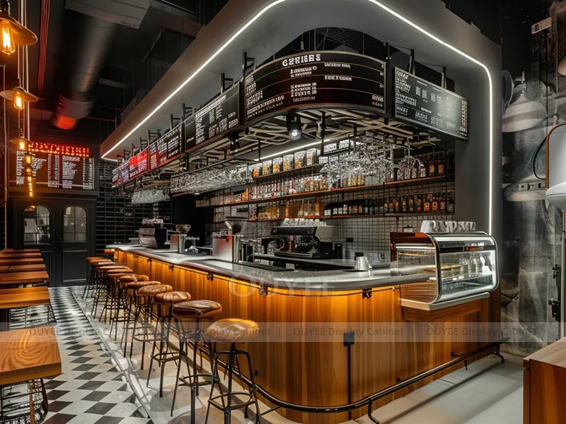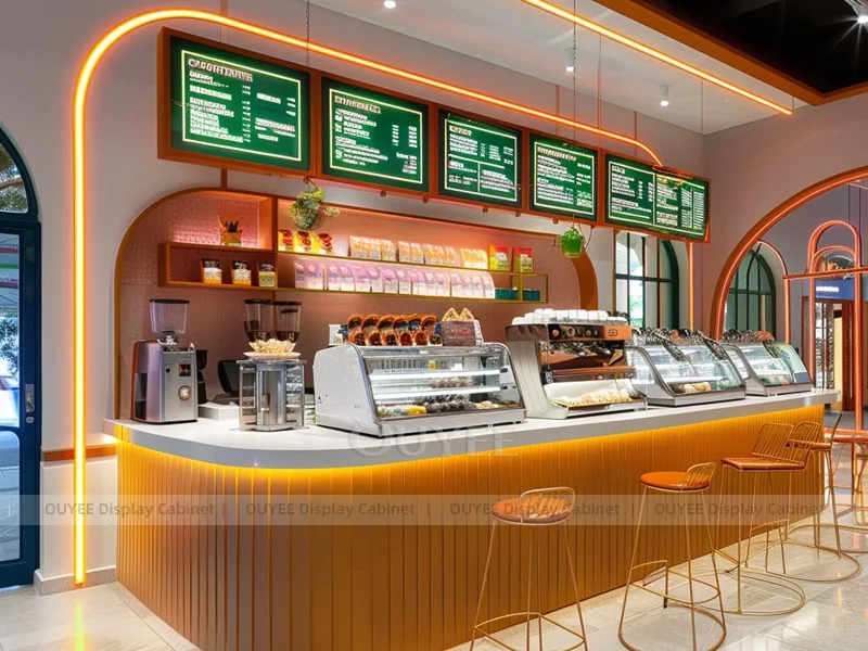 OUYEE supports coffee counter design, shop drawings, material selection, manufacturing, packing, and export delivery. We can customize the fixture according to your brand color, logo, store size, electrical planning, and installation requirements.
