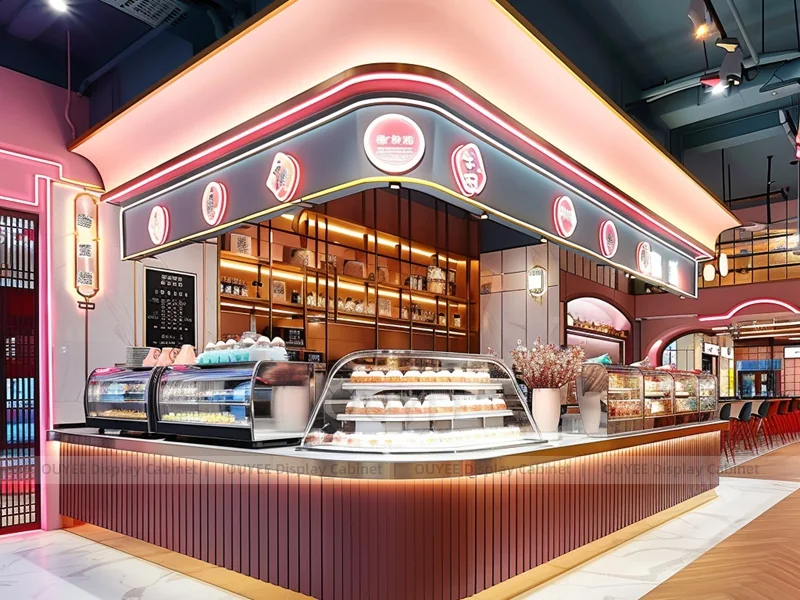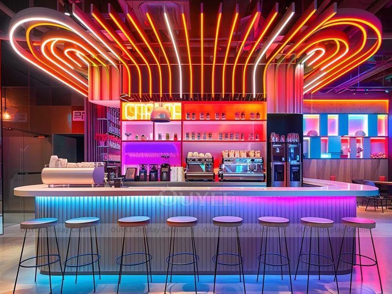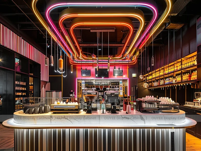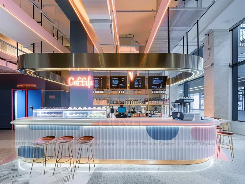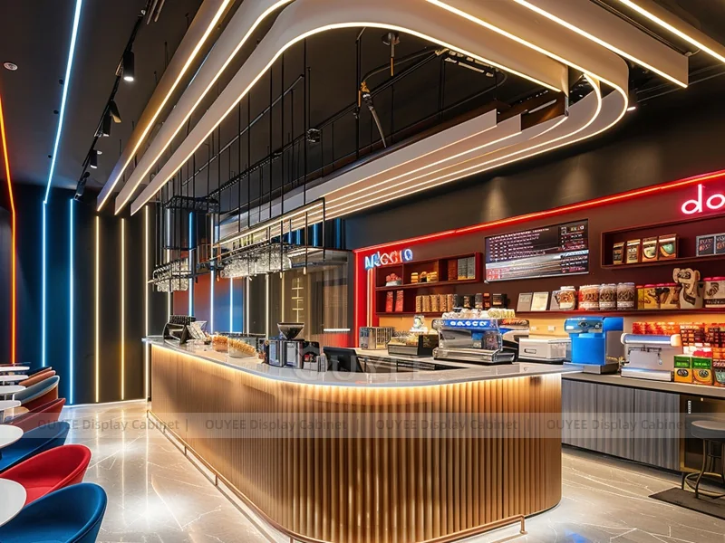 OUYEE supports coffee counter design, shop drawings, material selection, manufacturing, packing, and export delivery. We can customize the fixture according to your brand color, logo, store size, electrical planning, and installation requirements.