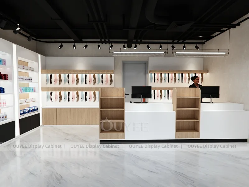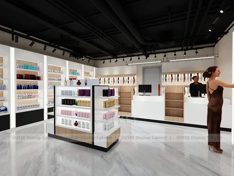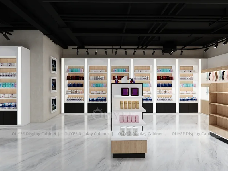 OUYEE can produce this model with commercial display panels, durable metal supports, tempered glass options, acrylic details, and integrated LED lighting. Dimensions, finish colors, shelf depths, light boxes, tester trays, logo panels, storage modules, and counter details can be adjusted to match the store plan and brand identity. Related inspiration is available across display shelves, wall display, display counter, and our store fixture manufacturing service.