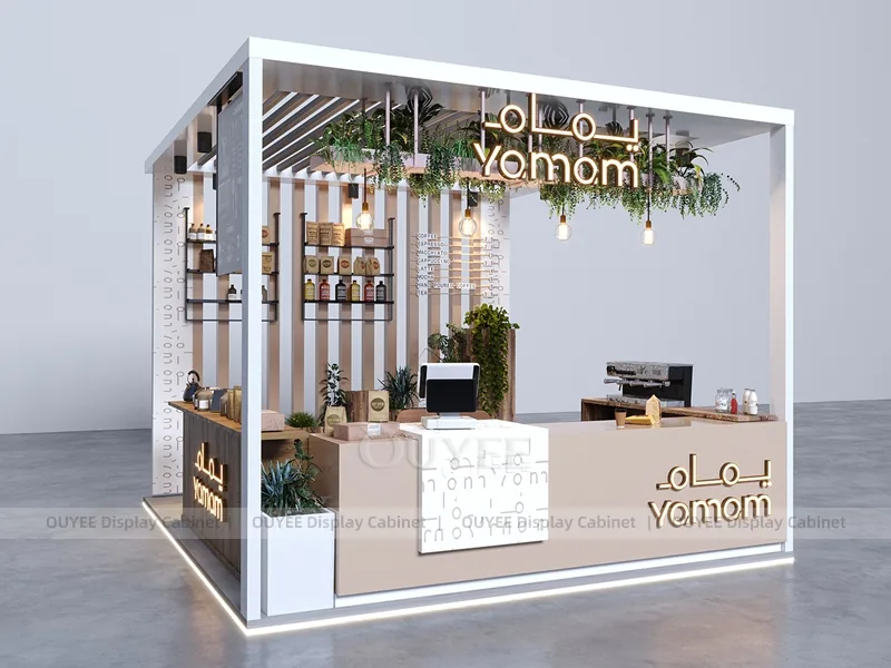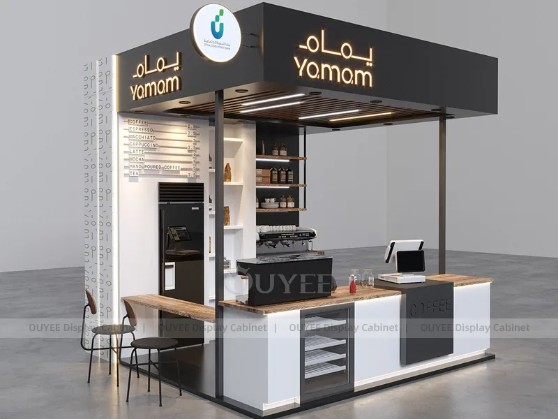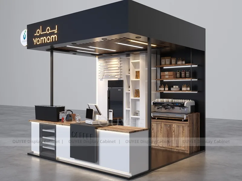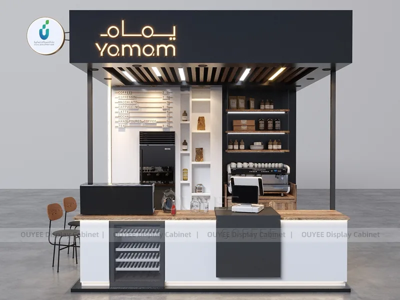 OUYEE can customize this model with powder-coated metal details, custom color retail finishes, and durable counter and storage modules. Store owners can adjust size, finish, layout, logo panel, counter height, storage structure, service opening, pickup area, cup storage, equipment clearance, menu areas, cup storage, topping display, lighting position, counter depth, and brand logo details to match the final shop drawing.