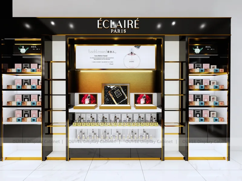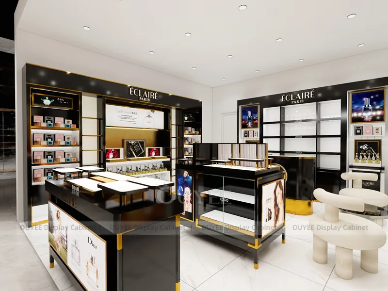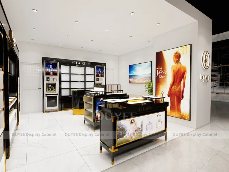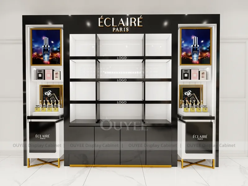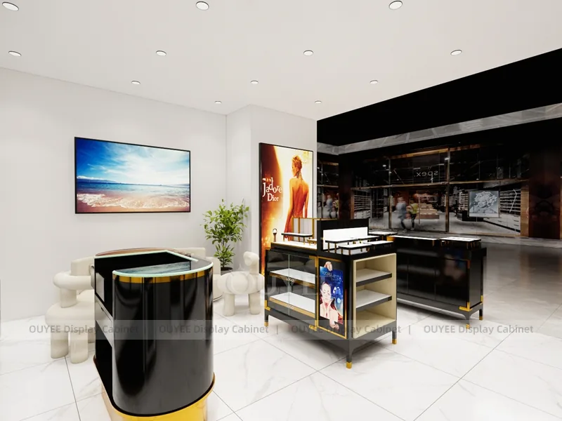OUYEE can produce this model with black retail panels, durable metal supports, glass display areas, and integrated LED lighting. Dimensions, finish colors, shelf depths, light boxes, tester trays, logo panels, storage modules, and counter details can be adjusted to match the store plan and brand identity. Related inspiration is available across display shelves, wall display, display counter, and our store fixture manufacturing service.
