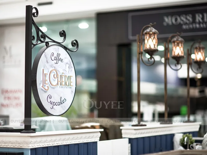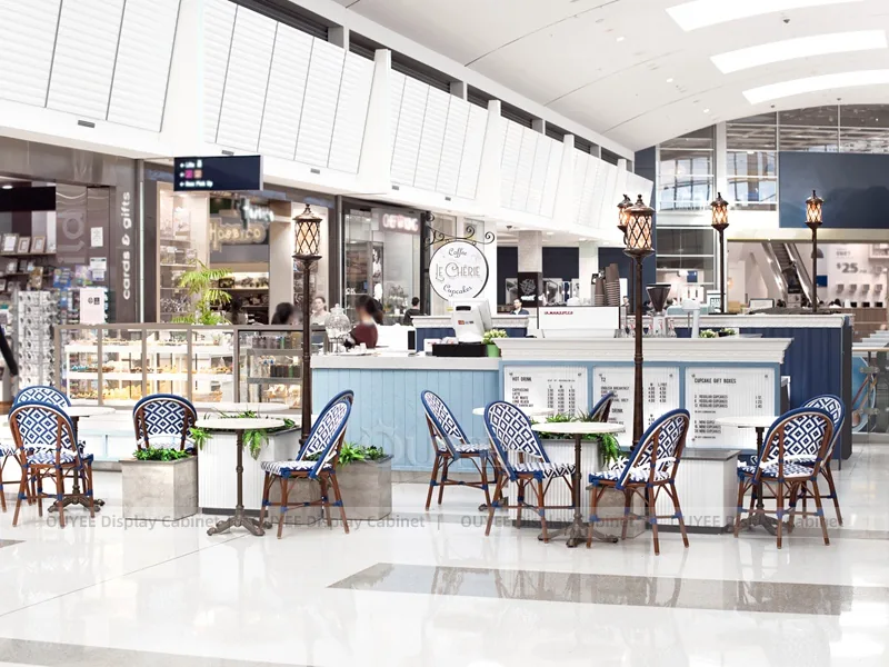 OUYEE can customize this model with custom color retail finishes and durable counter and storage modules. Store owners can adjust size, finish, layout, logo panel, counter height, storage structure, service opening, pickup area, cup storage, equipment clearance, menu areas, cup storage, topping display, lighting position, counter depth, and brand logo details to match the final shop drawing.